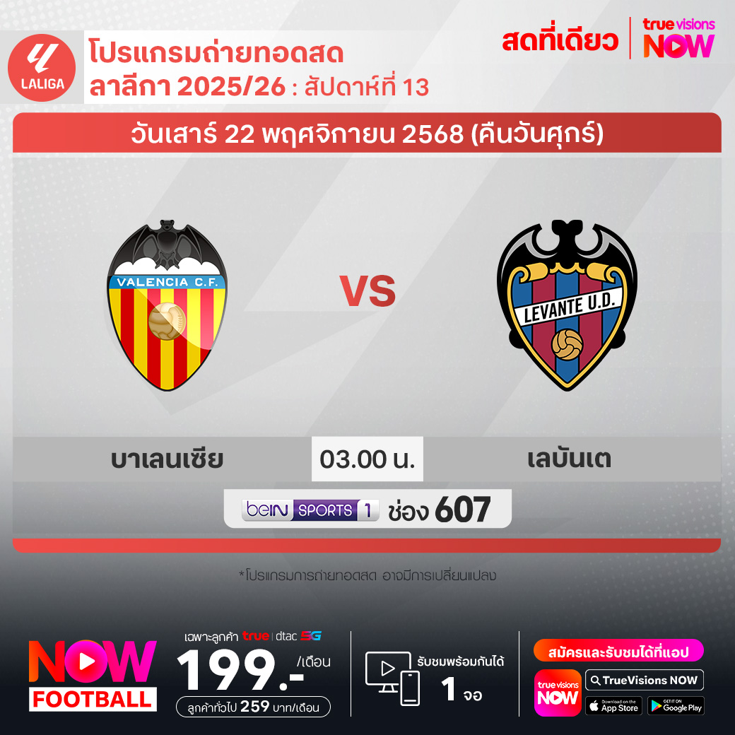Valencia vs Levante เวลา 03.00-05.00 ทางช่อง beIN 1 (607)