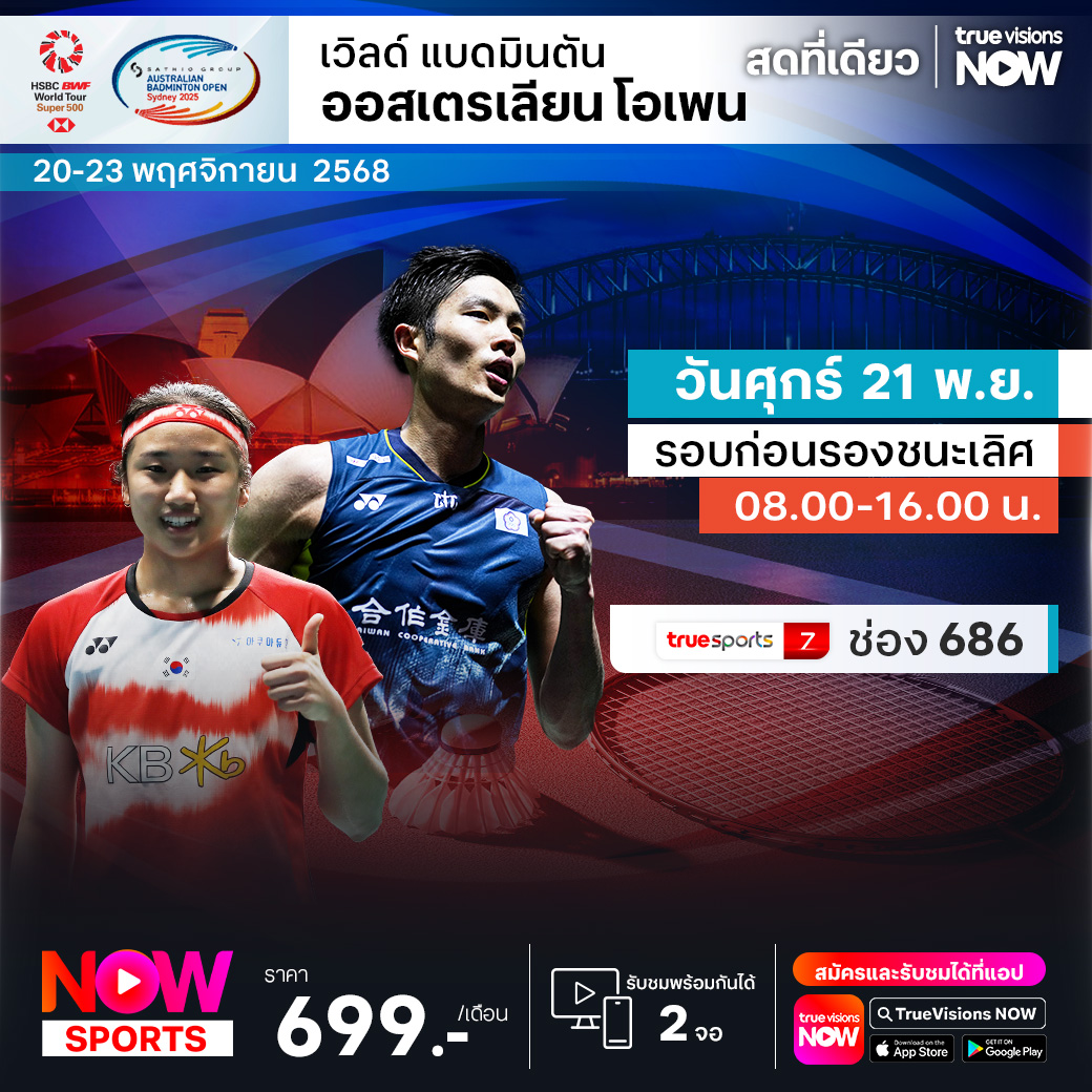แบดมินตันเก็บคะแนนสะสมโลก ใกล้มาถึงไคลแม็กซ์แล้ว ทุกชัยชนะและทุกคะแนนสะสมต่อจากนี้ ถือว่าสำคัญสุดๆ สัปดาห์นี้พบกับรายการ ออสเตรเลียน โอเพ่น ทัวร์นาเมนต์ระดับ เวิลด์ ทัวร์ ซูเปอร์ 500 ที่เควยี เซนเตอร์, โอลิมปิก บูโลวาร์ด, ซิดนี่ย์ ประเทศออสเตรเลีย ร่วมเชียร์ทีมแบดมินตันไทย สู้กับมือระดับโลกเพื่อลุ้นคว้าแชมป์ ชมสด ครบทุกรอบ ที่ ทรูวิชั่นส์
