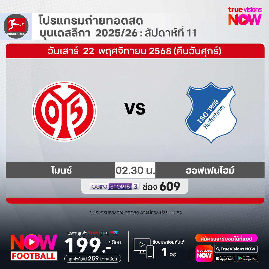 Mainz vs Hoffenheim เวลา 02.30-04.30 ทางช่อง beIN 3 (609)