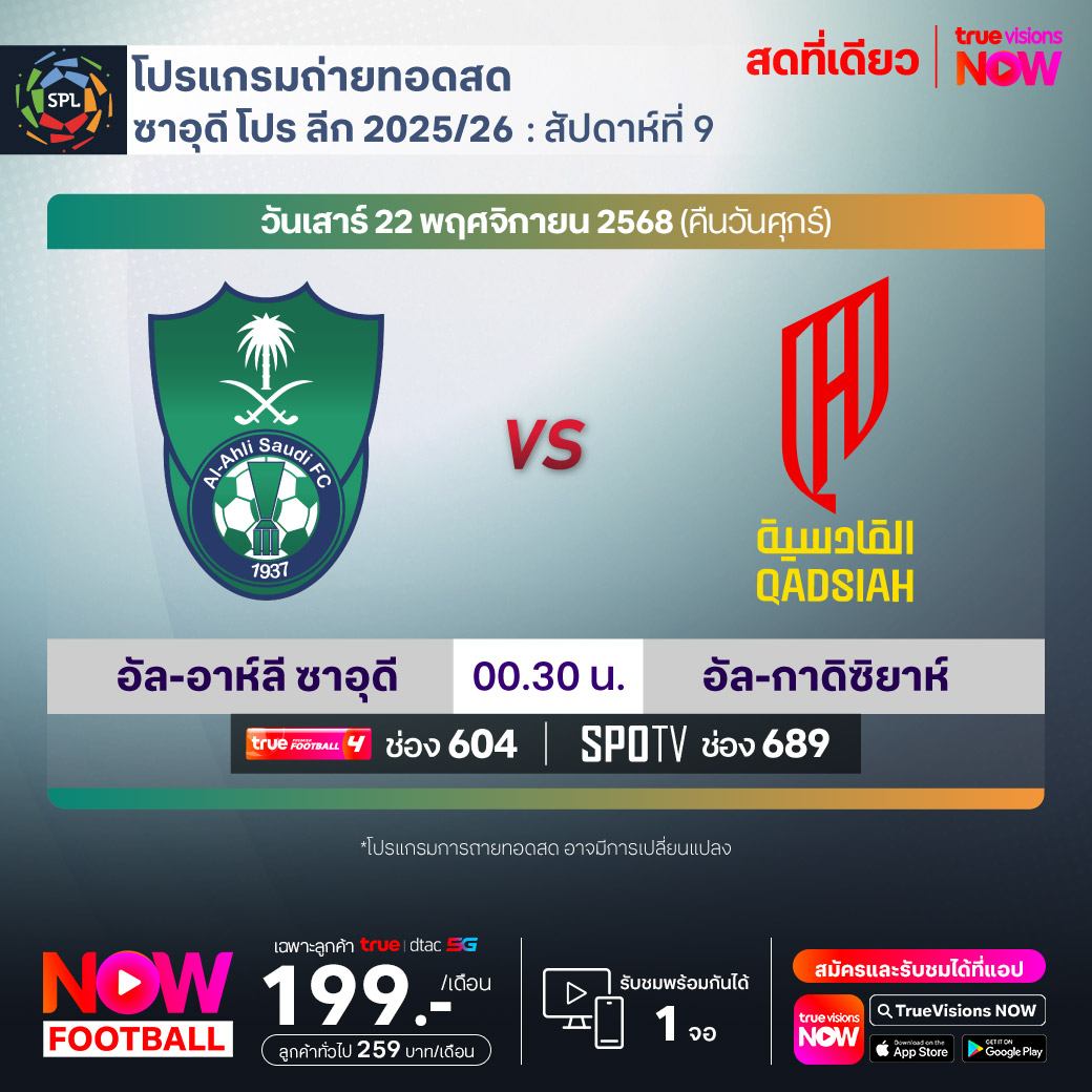 Al Ahli vs Al Qadsiah เวลา 00.30-02.30 ทางช่องTPF 4(604) / SPOTV (689)