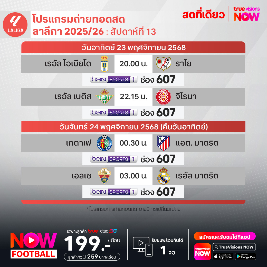Real Betis vs Girona เวลา 22.15-00.15 ทางช่อง beIN 1 (607)