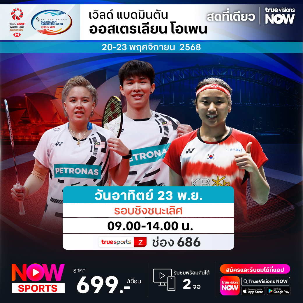 แบดมินตันเก็บคะแนนสะสมโลก ใกล้มาถึงไคลแม็กซ์แล้ว ทุกชัยชนะและทุกคะแนนสะสมต่อจากนี้ ถือว่าสำคัญสุดๆ สัปดาห์นี้พบกับรายการ ออสเตรเลียน โอเพ่น ทัวร์นาเมนต์ระดับ เวิลด์ ทัวร์ ซูเปอร์ 500 ที่เควยี เซนเตอร์, โอลิมปิก บูโลวาร์ด, ซิดนี่ย์ ประเทศออสเตรเลีย ร่วมเชียร์ทีมแบดมินตันไทย สู้กับมือระดับโลกเพื่อลุ้นคว้าแชมป์ ชมสด ครบทุกรอบ ที่ ทรูวิชั่นส์