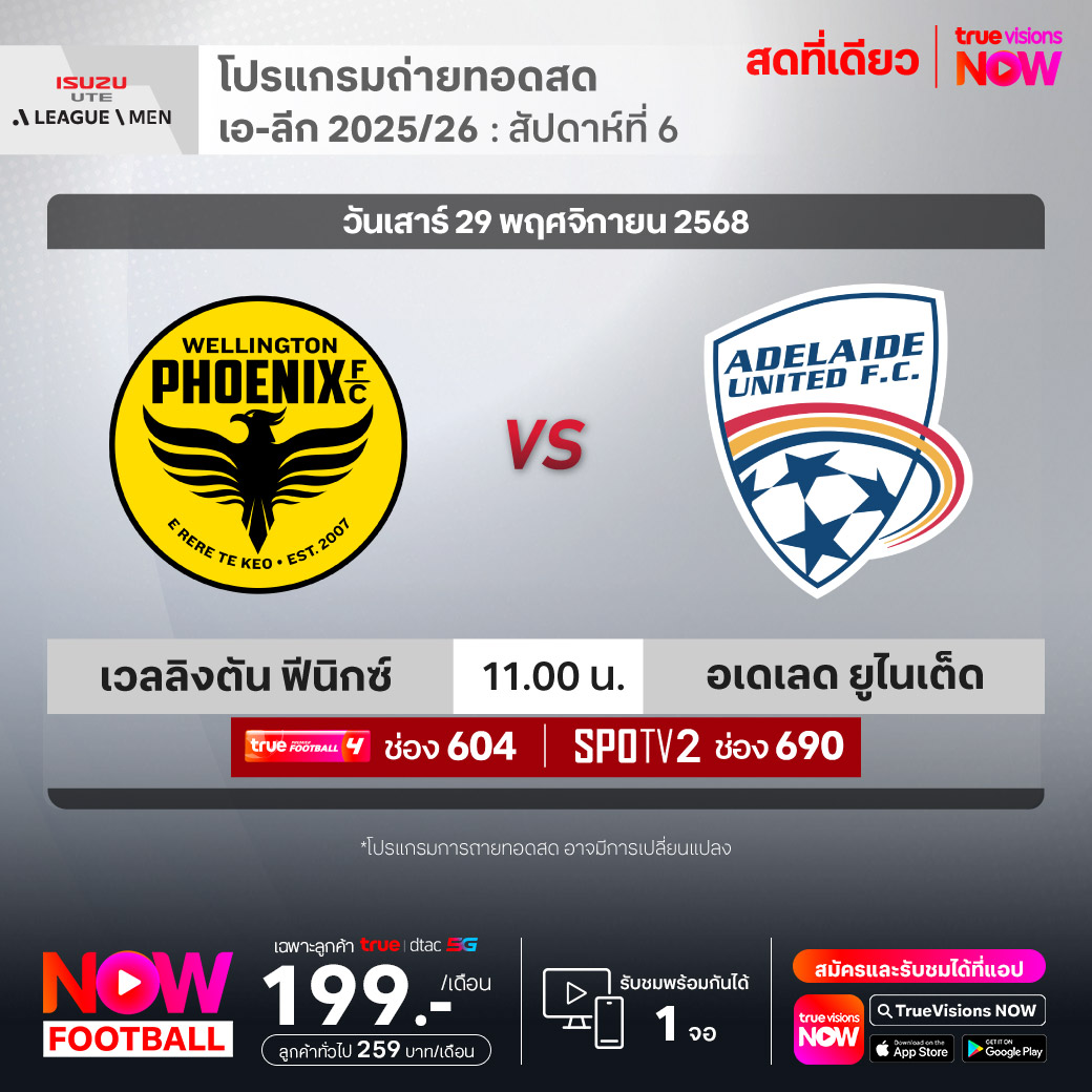 Wellington Phoenix vs Adelaide United เวลา 11.00-13.00 ทางช่องTPF 4(604) / SPOTV2 (690)