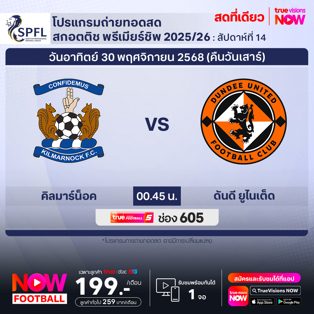Kilmarnock vs Dundee United เวลา 00.45-02.45 ทางช่องTPF 5(605)