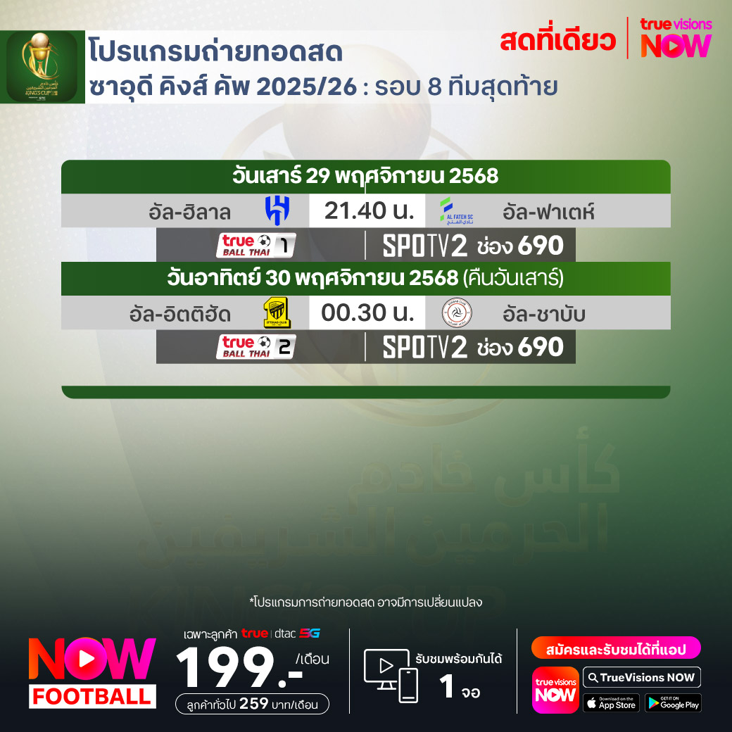 Al Hilal vs Al Fateh เวลา 21.40-23.40 ทางช่อง True Ball Thai 1 / SPOTV2 (690)