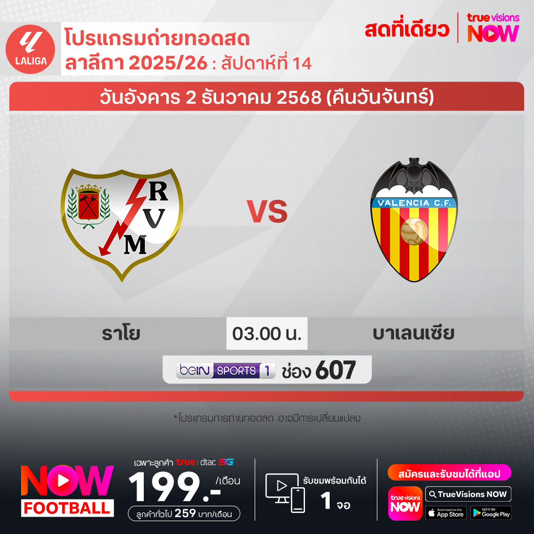 Rayo Vallecano vs Valencia เวลา 03.00-05.00 ทางช่อง beIN 1 (607)