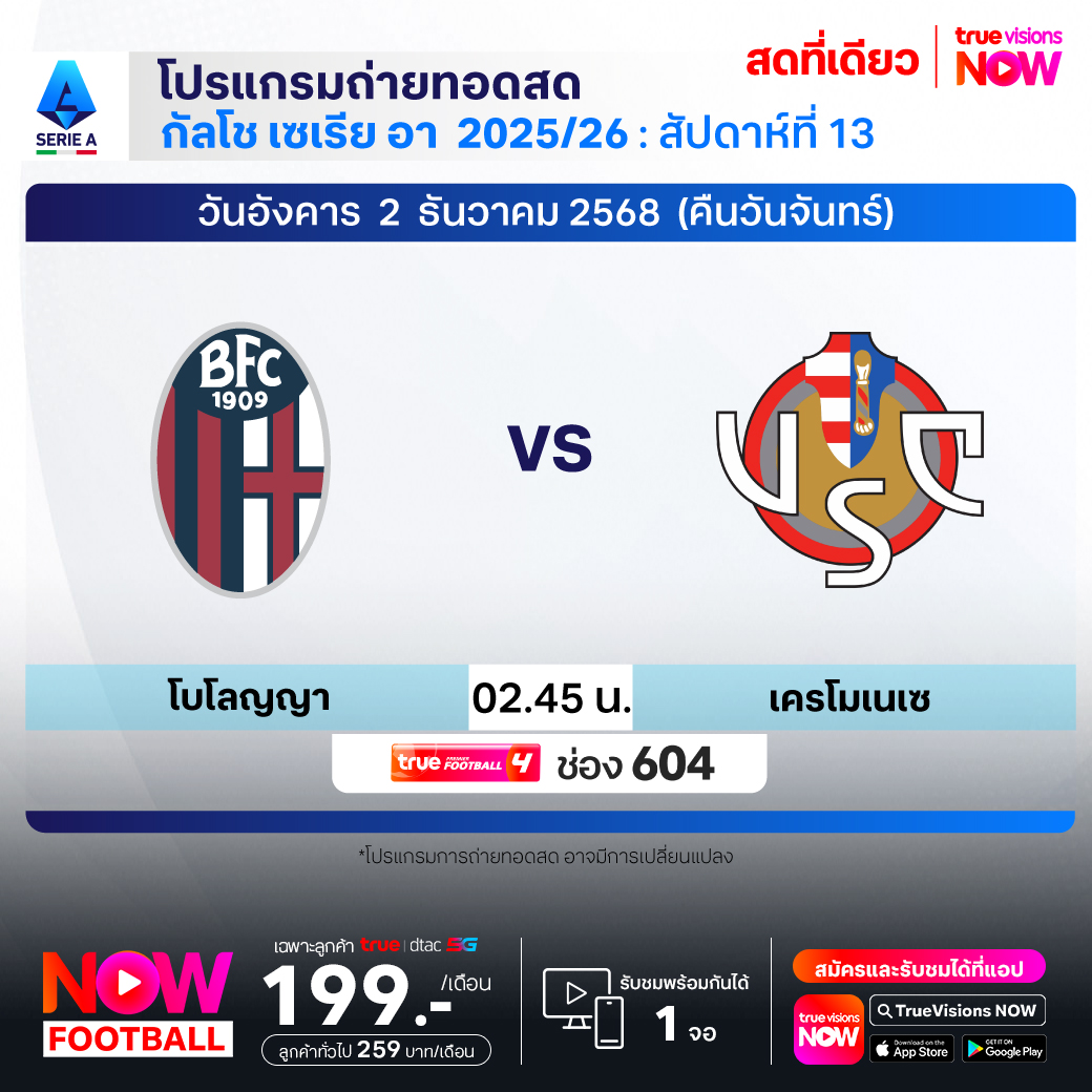 Bologna vs Cremonese เวลา 02.45-04.45 ทางช่องTPF 4(604)