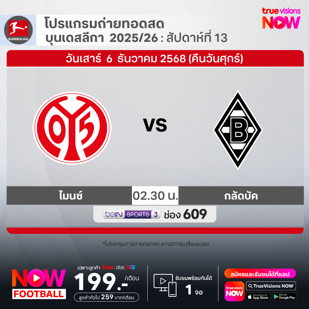 Mainz vs Monchengladbach เวลา 02.30-04.30 ทางช่อง beIN 3 (609)
