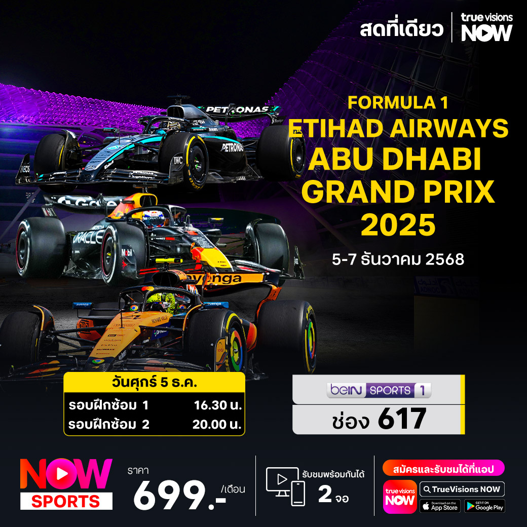 ศึก ฟอร์มูล่า วัน ประจำฤดุกาล 2025 เดินทางมาปิดฉากกันด้วยความยิ่งใหญ่ที่ อาบูดาบี กับเรซที่แฟนๆ ต้องไม่พลาดชม กับศึก อาบูดาบี กรังด์ปรีซ์ ที่ประเทศสหรัฐอาหรับเอเมิเรตส์ นักแข่งทุกคนต้องทุ่มเทและพยายามจะจบซีซั่นด้วยผลงานที่ประทับใจแฟนๆ รวมทั้งตำแหน่งแชมป์โลกประเภทนักแข่ง จากสังเวียนอันโด่งดัง ยาส มาริน่า เซอร์กิต ทีมใดจะจบได้อย่างเหนือชั้น นักแข่งคนใดจะสั่งลาปีด้วยผลงานที่ยอดเยี่ยม ชมสด ครบทุกช่วงการแข่งขัน ที่ ทรูวิชั่นส์