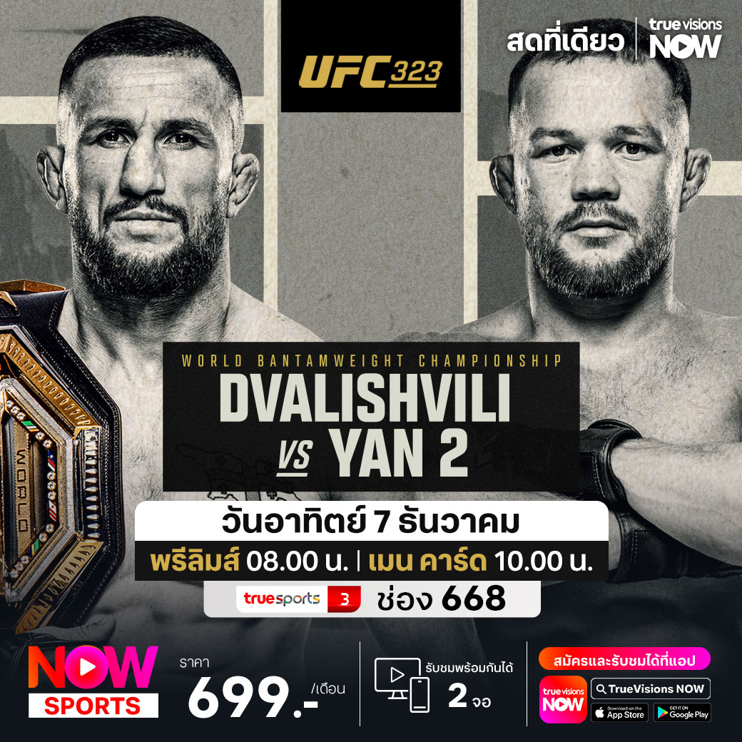 ศึกใหญ่ซูเปอร์ไฟต์ ประเดิมไฟต์สุดท้ายของปีที่แฟนๆ รอคอยกับ ยูเอฟซี 323 การเดิมพันเข็มขัดแชมป์รุ่นแบนตัมเวต ระหว่าง เมราบ ดีวาลิชวิลลี่ แชมป์ผู้ยิ่งใหญ่ชาวจอร์เจีย ขึ้นชกไฟต์ที่ 4 ของปี กับผู้ท้าชิงที่เป็นคู่ปรับเก่าจากรัสเซีย ปีเตอร์ ยาน ร่วมด้วยการชิงแชมป์รุ่นฟลายเวทระหว่าง อเล็กซานเดร ปันโตช่า เจ้าของตำแหน่งจากบราซิล กับผู้ท้าชิงอันดับ 1 โจชัว แวน นักสู้เอ็มเอ็มเอ สายเลือดเมียนมา ชมสด เอ็กซ์คลูซีฟ จาก ที-โมบายล์ อารีน่า ลาสเวกัส สหรัฐอเมริกา ทาง ทรูวิชั่นส์ ที่เดียว