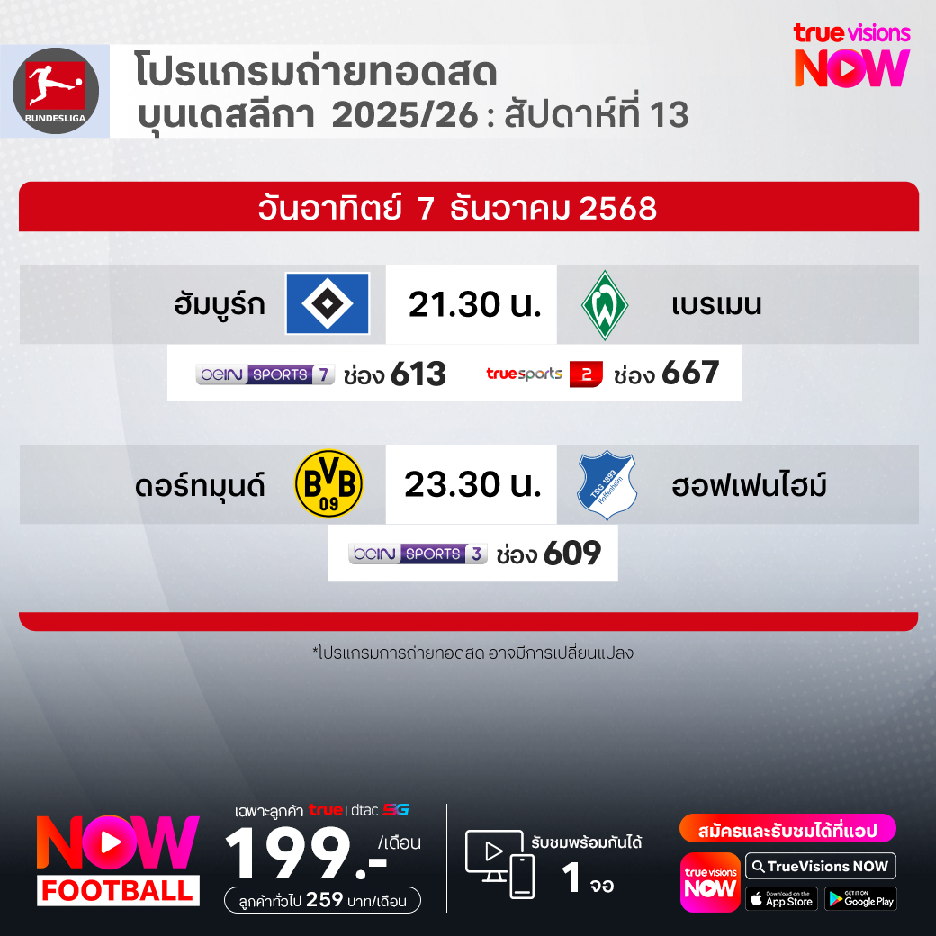 Hamburg vs Werder Bremen เวลา 21.30-23.30 ทางช่อง beIN 7 (613) / TS 2 (667)