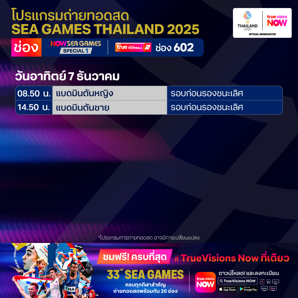 วันนี้มีอะไรดูที่ ทรูวิชั่นส์ ประจำวันอาทิตย์ที่ 7 ธันวาคม 68 ยังคงมีกีฬาที่น่าสนใจให้ได้ตามลุ้นตามเชียร์กันเหมือนเดิม โดยในส่วนของฟุตบอลนั้นยังมีศึก ลา ลีกา สเปน, บุนเดสลีกา เยอรมนี, กัลโช่ เซเรีย อา อิตาลี, สกอตติช พรีเมียร์ชิพ และ เอ-ลีก ออสเตรเลีย ให้ได้ตามเชียร์กันต่อ ส่วนคอมอเตอร์สปอร์ต พลาดไม่ได้กับศึก ฟอร์มูล่า วัน รายการ อาบูดาบี กรังด์ปรีซ์ และ ฟอร์มูล่า ทู แชมเปี้ยนชิพ ยาส มาริน่า อาบูดาบี ขณะที่การแข่งขันซีเกมส์ มี ฟุตบอลหญิง และ แบดมินตัน ให้ได้ตามเชียร์กัน ส่วนกีฬาอื่นๆ ยังมี กอล์ฟ พีจีเอ ทัวร์ รายการ ฮีโร่ เวิลด์ ชาลเลนจ์, ดีพี เวิลด์ ทัวร์ รายการ คราวน์ ออสเตรเลียน โอเพ่น และรายการ เนดแบงค์ กอล์ฟ ชาลเลนจ์, เวิลด์ สนุกเกอร์ ทัวร์ รายการ ยูเค แชมเปี้ยนชิพ, ศึก ยูเอฟซี 323, ศึก เวิลด์ บ็อกซิ่ง และ วอลเลย์บอล วี-ลีก งานนี้ ทรูวิชั่นส์ จัดเต็มให้ชมกันถึงบ้าน