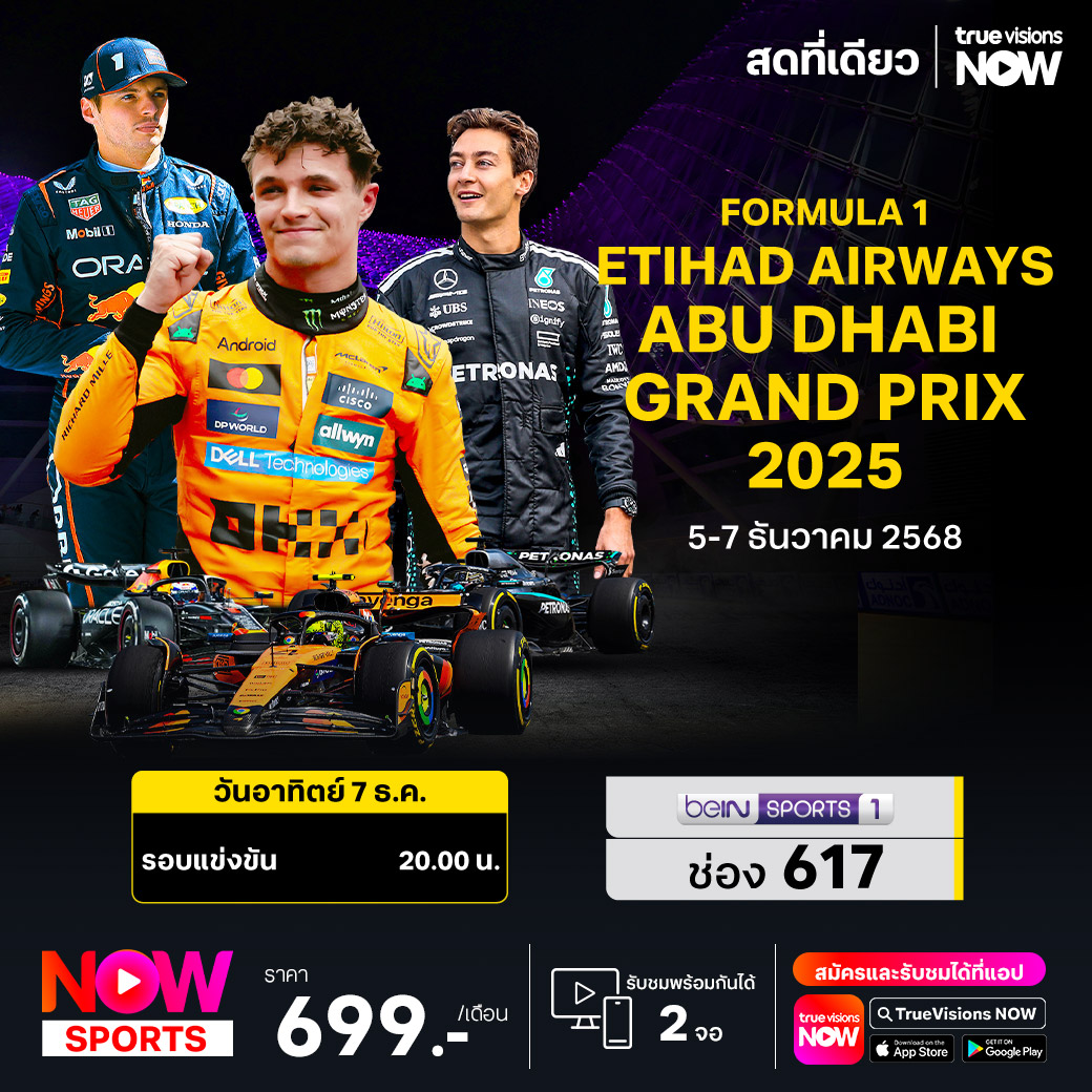 ศึก ฟอร์มูล่า วัน ประจำฤดุกาล 2025 เดินทางมาปิดฉากกันด้วยความยิ่งใหญ่ที่ อาบูดาบี กับเรซที่แฟนๆ ต้องไม่พลาดชม กับศึก อาบูดาบี กรังด์ปรีซ์ ที่ประเทศสหรัฐอาหรับเอเมิเรตส์ นักแข่งทุกคนต้องทุ่มเทและพยายามจะจบซีซั่นด้วยผลงานที่ประทับใจแฟนๆ รวมทั้งตำแหน่งแชมป์โลกประเภทนักแข่ง จากสังเวียนอันโด่งดัง ยาส มาริน่า เซอร์กิต ทีมใดจะจบได้อย่างเหนือชั้น นักแข่งคนใดจะสั่งลาปีด้วยผลงานที่ยอดเยี่ยม ชมสด ครบทุกช่วงการแข่งขัน ที่ ทรูวิชั่นส์