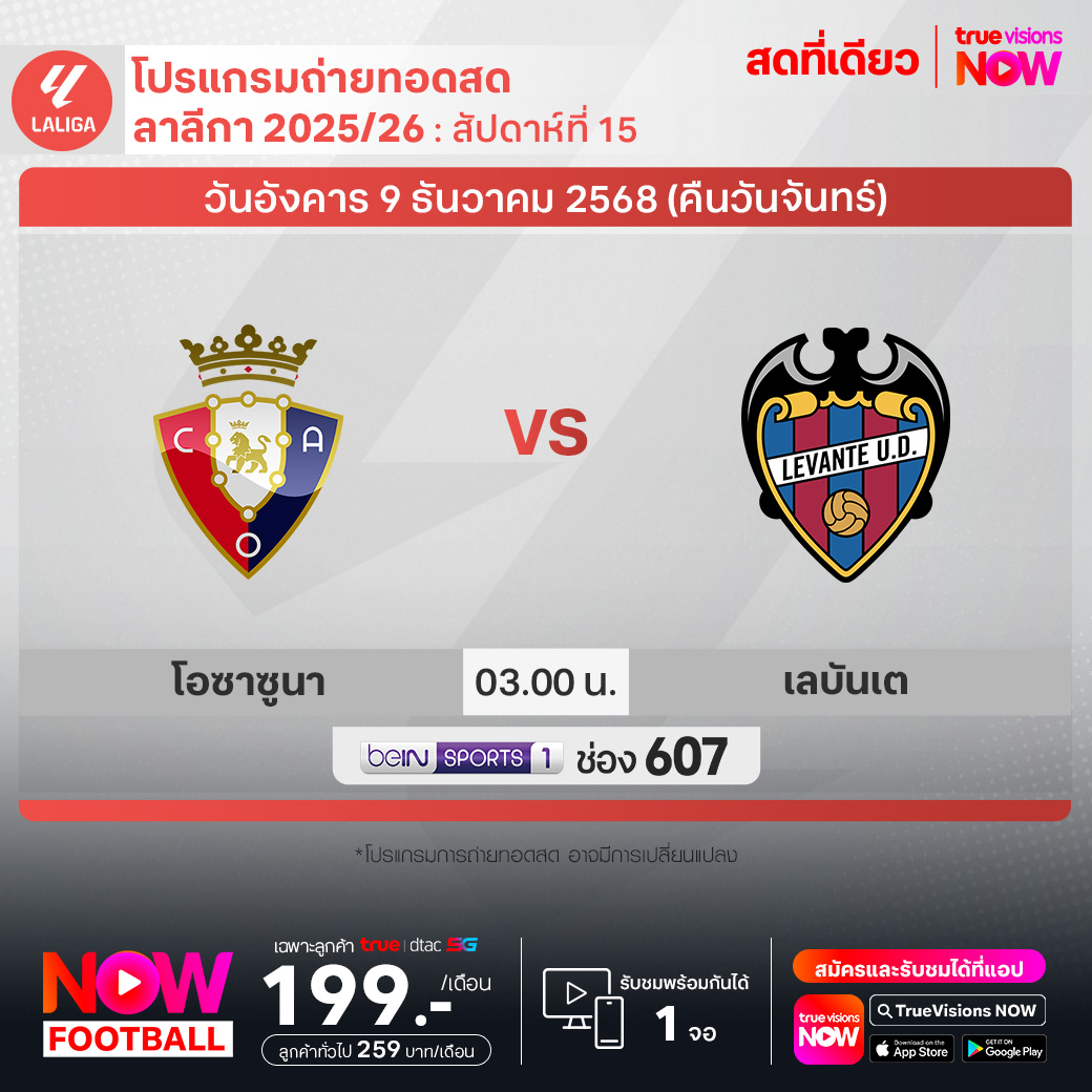 Osasuna vs Levante เวลา 03.00-05.00 ทางช่อง beIN 1 (607)
