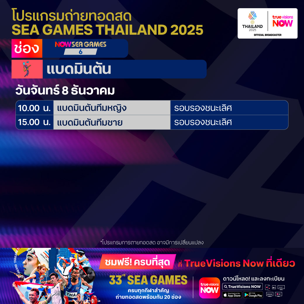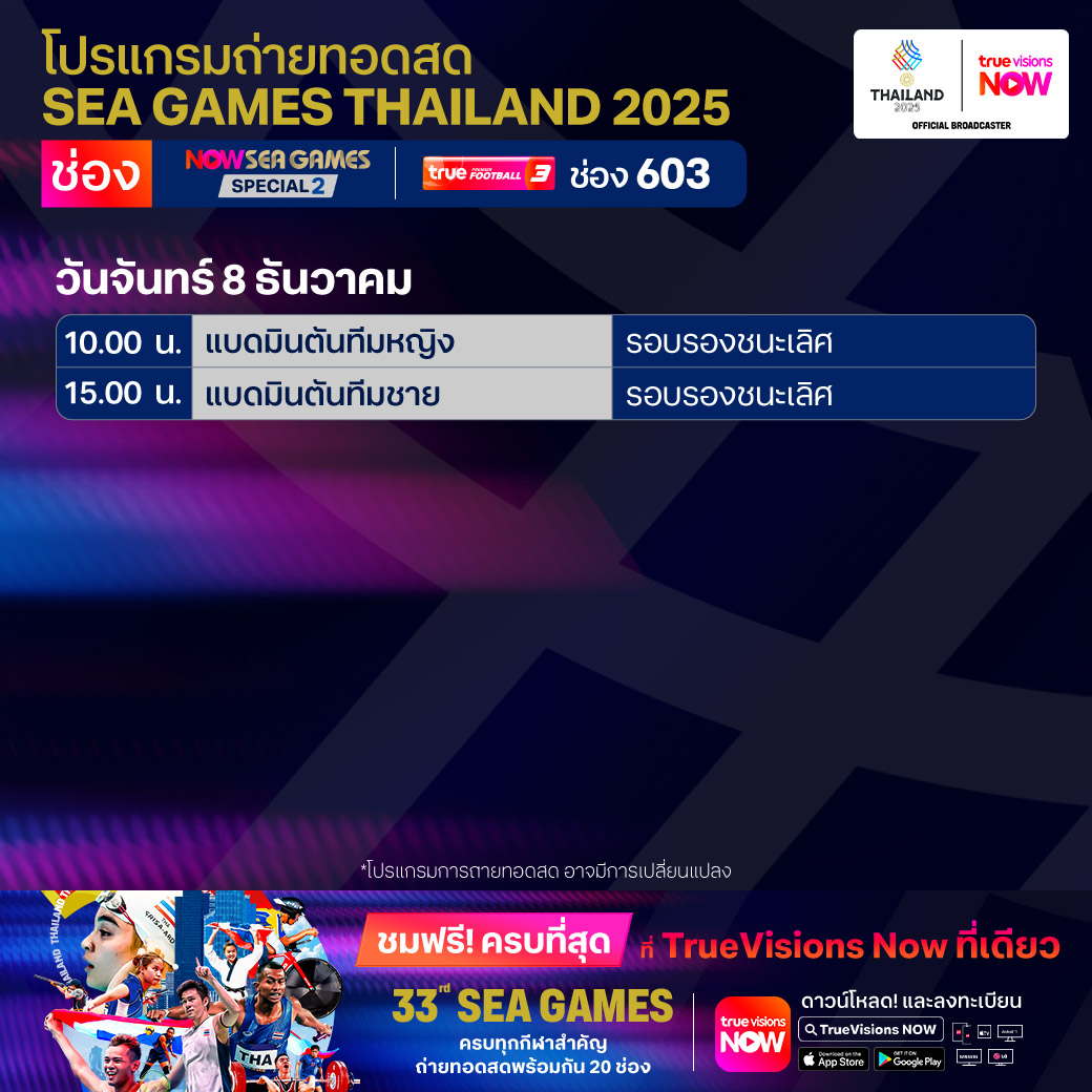 วันนี้มีอะไรดูที่ ทรูวิชั่นส์ ประจำวันจันทร์ที่ 8 ธันวาคม 68 ยังคงมีกีฬาที่น่าสนใจให้ได้ตามลุ้นตามเชียร์กันเหมือนเดิม โดยในส่วนของฟุตบอลนั้นยังมีศึก ลา ลีกา สเปน และ กัลโช่ เซเรีย อา อิตาลี ให้ได้ตามเชียร์กันต่อ ส่วนกีฬาซีเกมส์ 2025 ยังมีถ่ายทอดสดอีกหลายชนิดกีฬาให้ได้ติดตาม ไม่ว่าจะเป็น ฟุตบอลชาย, ฟุตบอลหญิง และ แบดมินตัน ทีมชาย-หญิง งานนี้ ทรูวิชั่นส์ จัดเต็มให้ชมกันถึงบ้าน