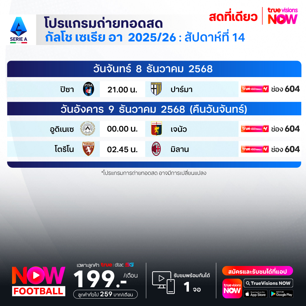 Udinese vs Genoa เวลา 00.00-02.00 ทางช่องTPF 4(604)