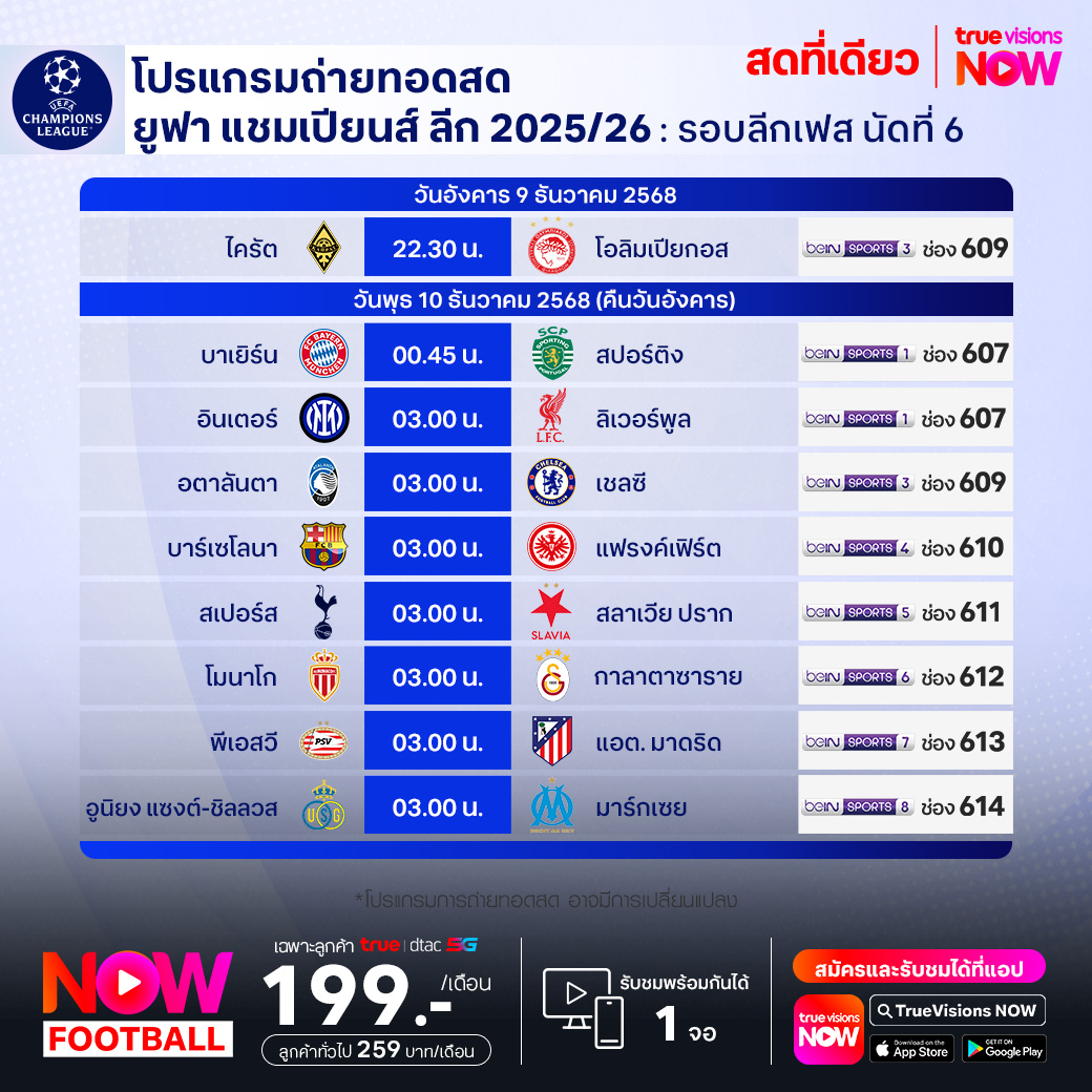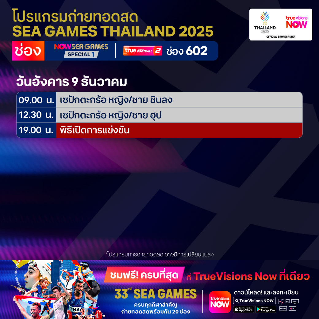 วันนี้มีอะไรดูที่ ทรูวิชั่นส์ ประจำวันอังคารที่ 9 ธันวาคม 68 ยังคงมีกีฬาที่น่าสนใจให้ได้ตามลุ้นตามเชียร์กันเหมือนเดิม โดยในส่วนของฟุตบอลนั้นยังมีศึก ยูฟ่า แชมเปี้ยนส์ ลีก ให้ได้ตามเชียร์กันต่อ ส่วนกีฬาซีเกมส์ 2025 เริ่มอย่างเป็นทางการแล้ววันนี้ ไม่ว่าจะเป็นพิธีเปิด และยังมีถ่ายทอดสดการแข่งขัน เซปักตะกร้อ นอกจากนี้กีฬาอื่นๆ ยังมีศึกวอลเลย์บอล วี-ลีก ให้ได้ตามลุ้นกันต่อ งานนี้ ทรูวิชั่นส์ จัดเต็มให้ชมกันถึงบ้าน