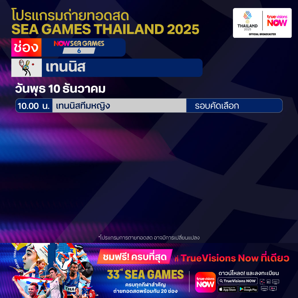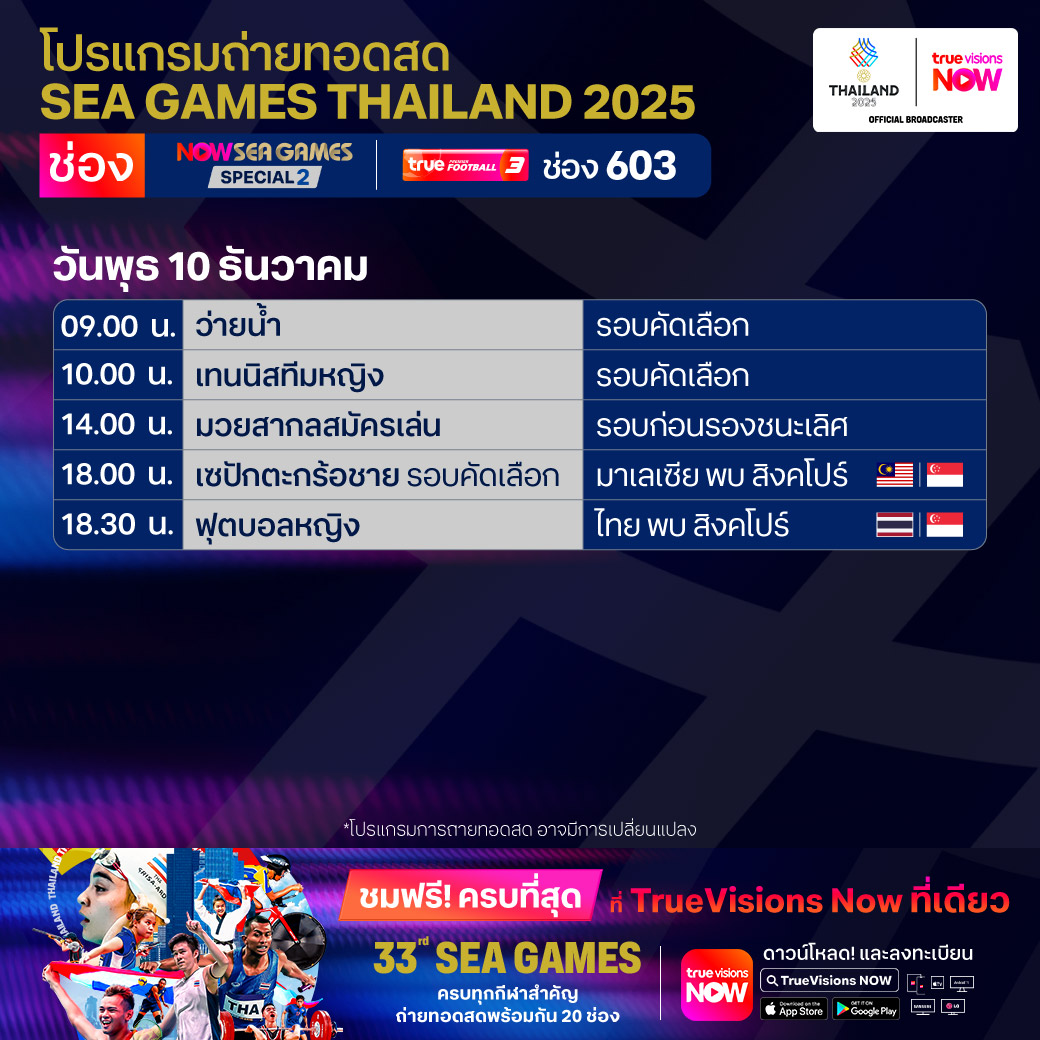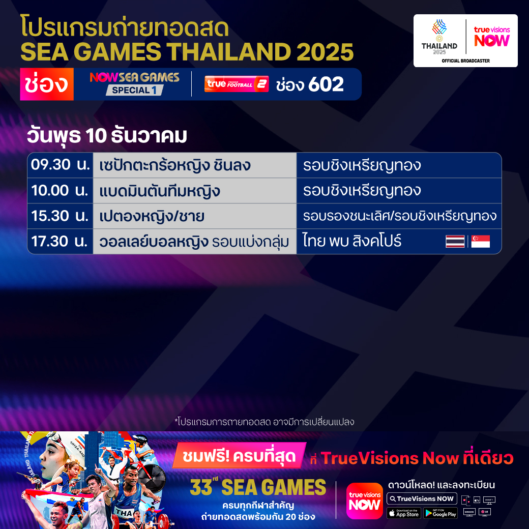 วันนี้มีอะไรดูที่ ทรูวิชั่นส์ ประจำวันพุธที่ 10 ธันวาคม 68 ยังคงมีกีฬาที่น่าสนใจให้ได้ตามลุ้นตามเชียร์กันเหมือนเดิม โดยในส่วนของฟุตบอลนั้นยังมีศึก ยูฟ่า แชมเปี้ยนส์ ลีก รอบ ลีก เฟส ให้ได้ตามเชียร์กันต่อ ส่วนกีฬาซีเกมส์ 2025 ยังมีถ่ายทอดสดหลายชิดกีฬาให้ได้ติดตามกัน นอกจากนี้กีฬาอื่นๆ ยังมีศึก เวิลด์ สนุกเกอร์ ทัวร์ รายการ ชู้ตเอาท์ และ วอลเลย์บอล วี-ลีก งานนี้ ทรูวิชั่นส์ จัดเต็มให้ชมกันถึงบ้าน