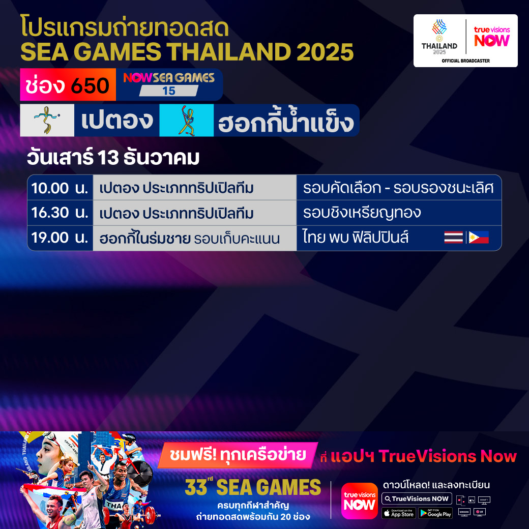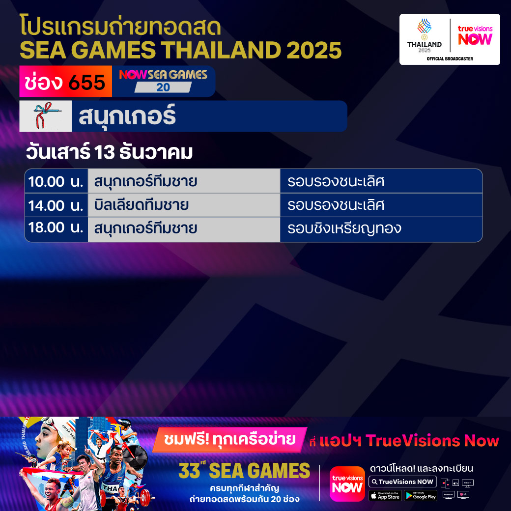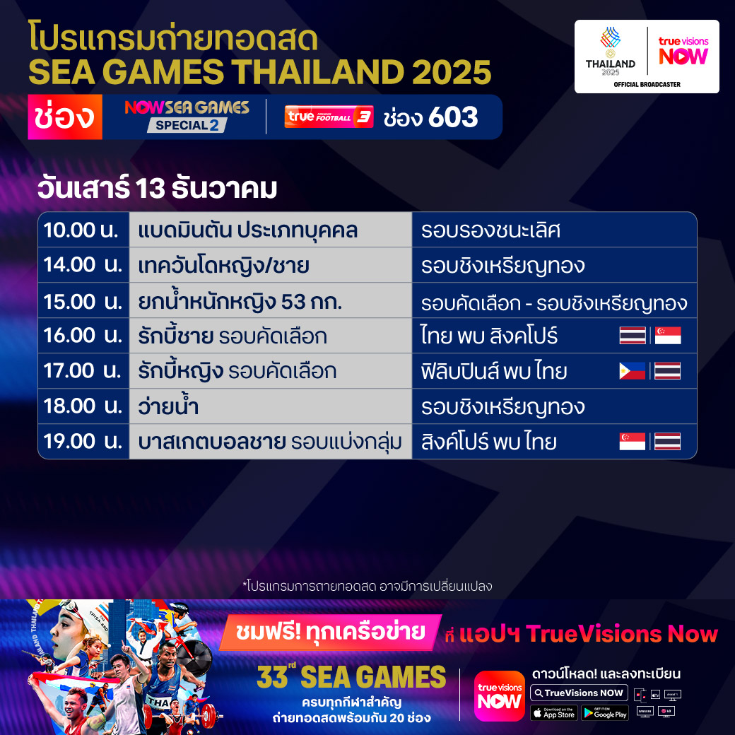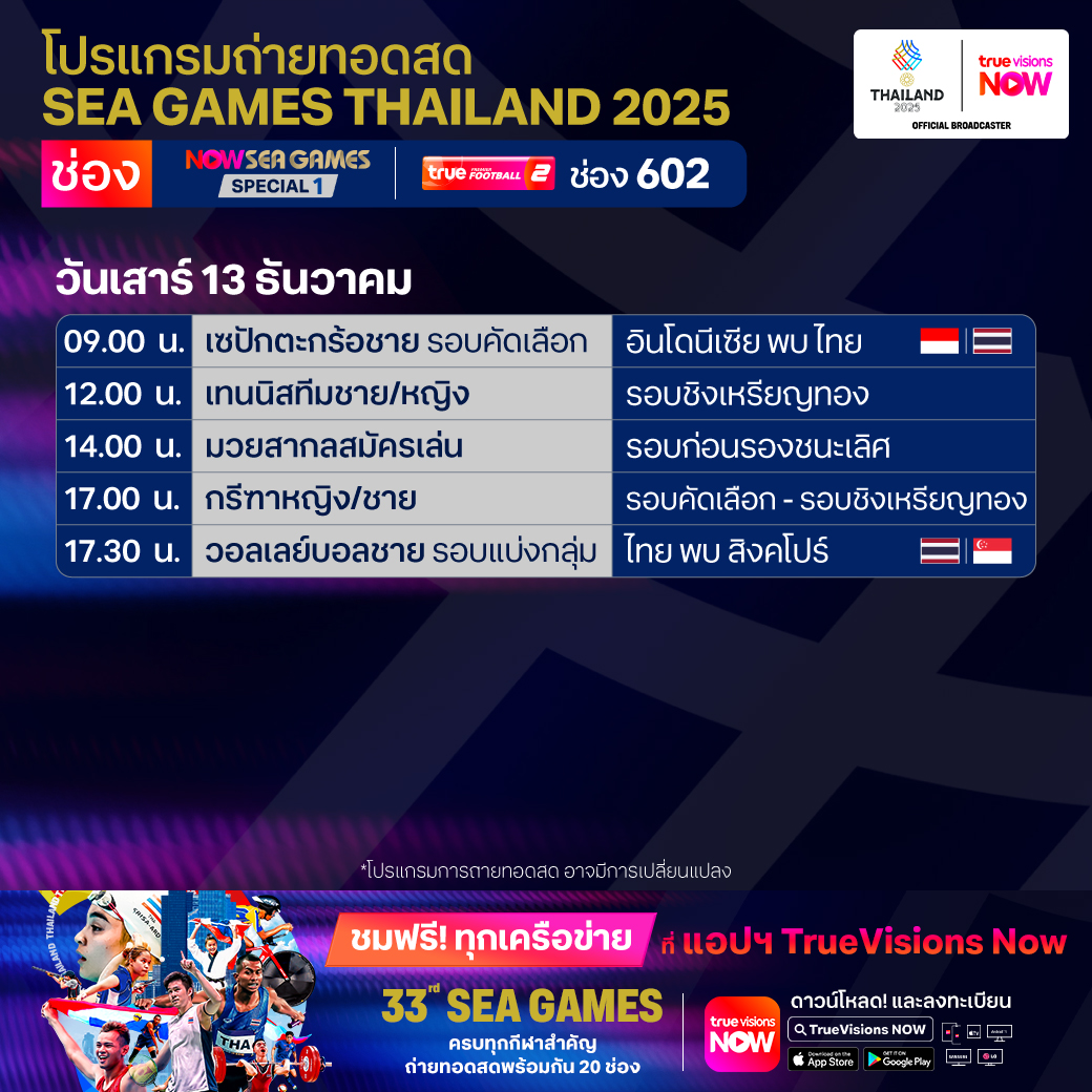 วันนี้มีอะไรดูที่ ทรูวิชั่นส์ ประจำวันเสาร์ที่ 13 ธันวาคม 68 ยังคงมีกีฬาที่น่าสนใจให้ได้ตามลุ้นตามเชียร์กันเหมือนเดิม โดยในส่วนของฟุตบอลนั้นยังมีศึก ลา ลีกา สเปน, บุนเดสลีกา เยอรมนี, กัลโช่ เซเรีย อา อิตาลี และ สกอตติช พรีเมียร์ชิพ ให้ได้ตามเชียร์กันต่อ ส่วนกีฬาซีเกมส์ 2025 ยังมีถ่ายทอดสดหลายชนิดกีฬาให้ได้ติดตามกัน นอกจากนี้กีฬาอื่นๆ ยังมี กอล์ฟ ดีพี เวิลด์ ทัวร์ รายการ อัลเฟร็ด ดันฮิลล์ แชมเปี้ยนชิพ, กอล์ฟ พีจีเอ แกรนท์ ธอร์นตัน อินวิเตชั่น, เวิลด์ สนุกเกอร์ ทัวร์ รายการ ชู้ตเอาท์ และ วอลเลย์บอล วี-ลีก งานนี้ ทรูวิชั่นส์ จัดเต็มให้ชมกันถึงบ้าน
