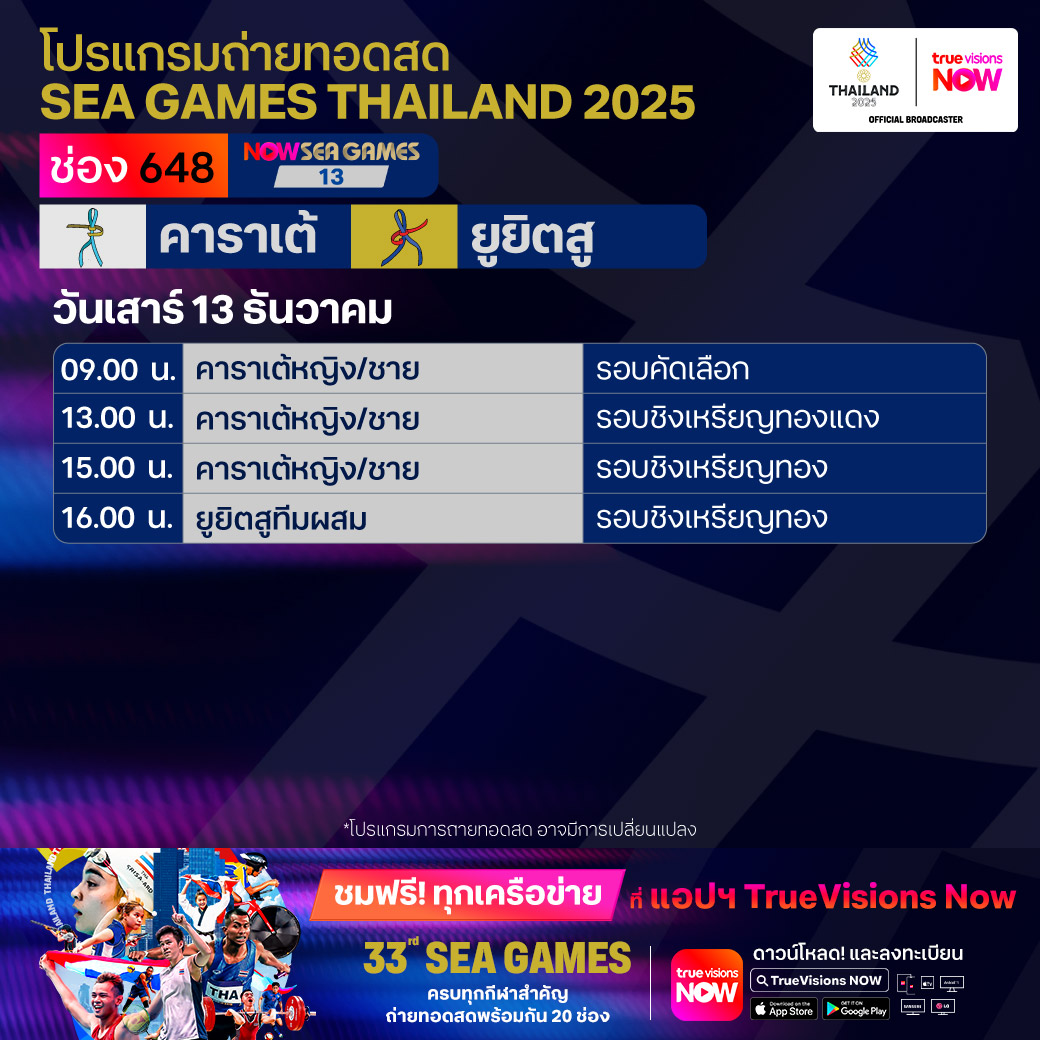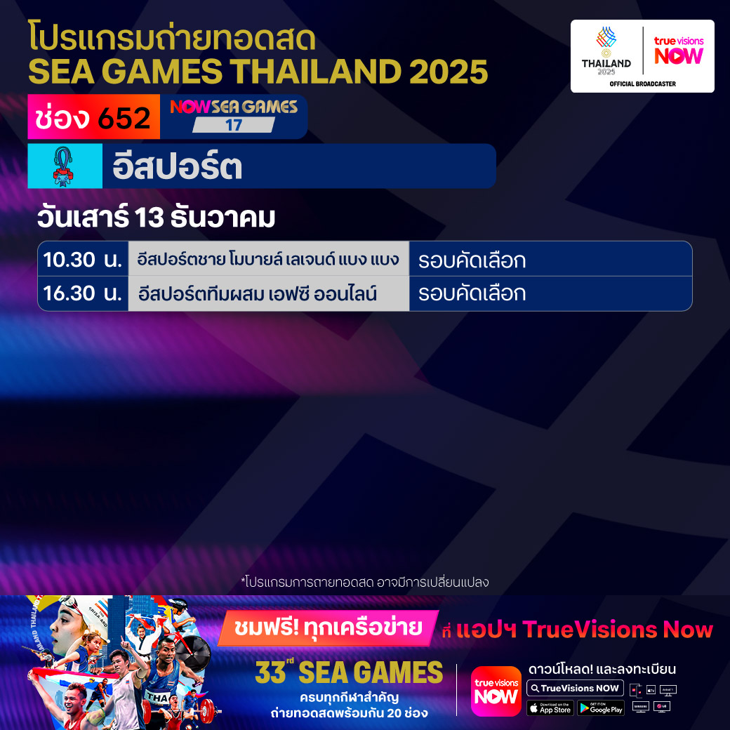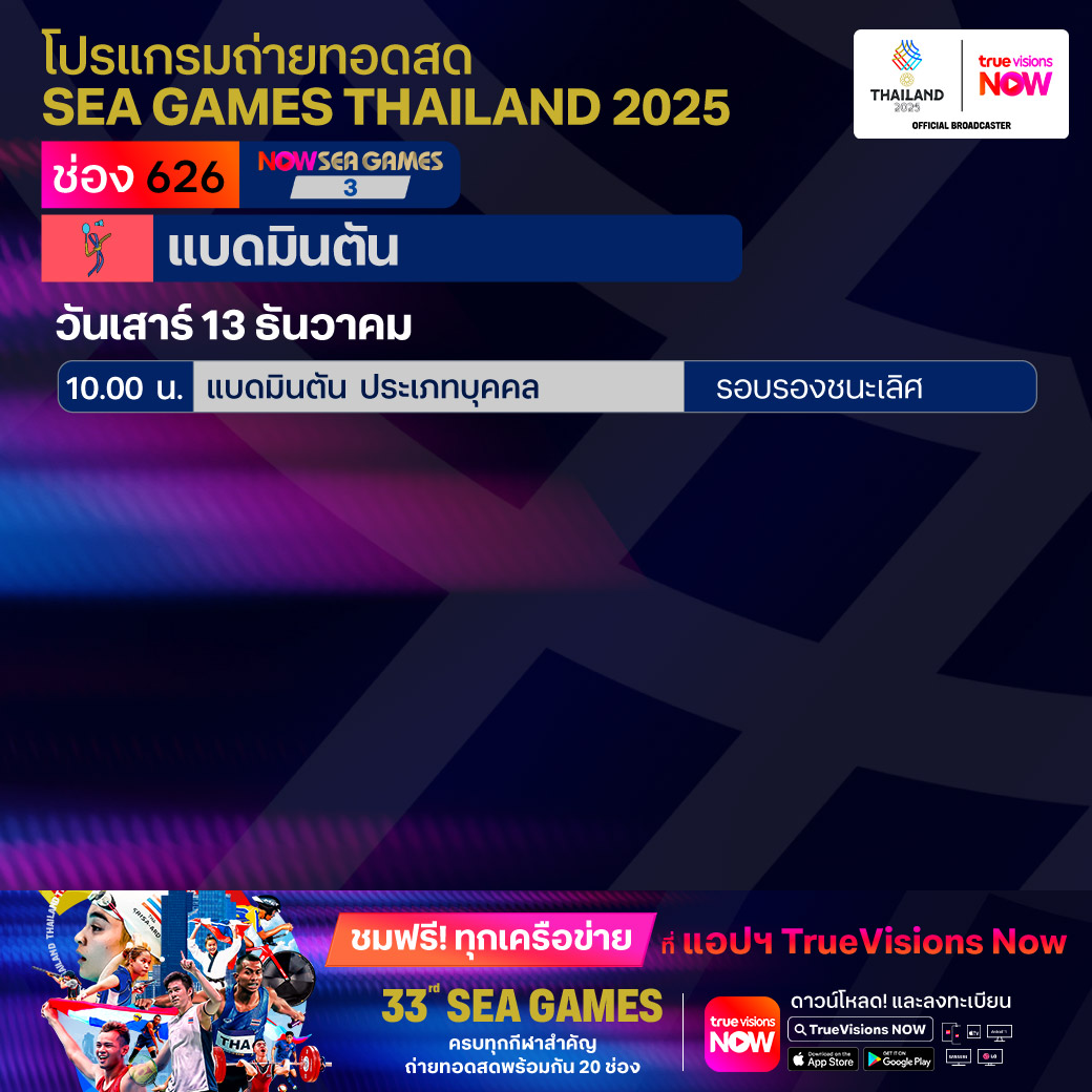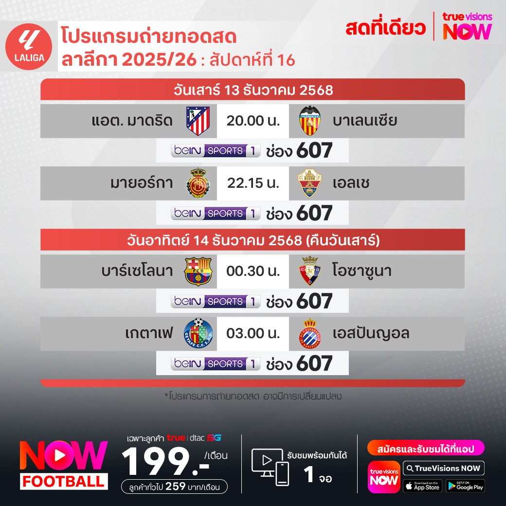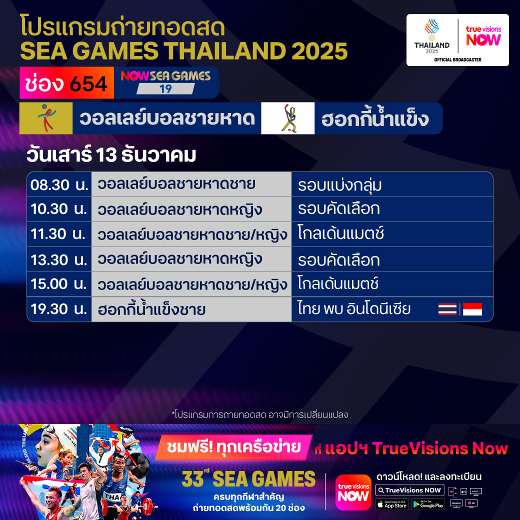วันนี้มีอะไรดูที่ ทรูวิชั่นส์ ประจำวันเสาร์ที่ 13 ธันวาคม 68 ยังคงมีกีฬาที่น่าสนใจให้ได้ตามลุ้นตามเชียร์กันเหมือนเดิม โดยในส่วนของฟุตบอลนั้นยังมีศึก ลา ลีกา สเปน, บุนเดสลีกา เยอรมนี, กัลโช่ เซเรีย อา อิตาลี และ สกอตติช พรีเมียร์ชิพ ให้ได้ตามเชียร์กันต่อ ส่วนกีฬาซีเกมส์ 2025 ยังมีถ่ายทอดสดหลายชนิดกีฬาให้ได้ติดตามกัน นอกจากนี้กีฬาอื่นๆ ยังมี กอล์ฟ ดีพี เวิลด์ ทัวร์ รายการ อัลเฟร็ด ดันฮิลล์ แชมเปี้ยนชิพ, กอล์ฟ พีจีเอ แกรนท์ ธอร์นตัน อินวิเตชั่น, เวิลด์ สนุกเกอร์ ทัวร์ รายการ ชู้ตเอาท์ และ วอลเลย์บอล วี-ลีก งานนี้ ทรูวิชั่นส์ จัดเต็มให้ชมกันถึงบ้าน