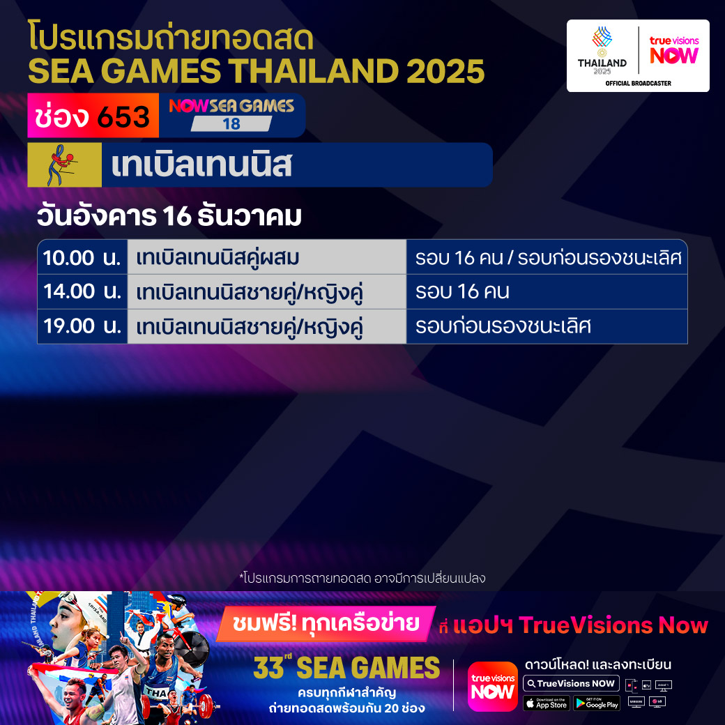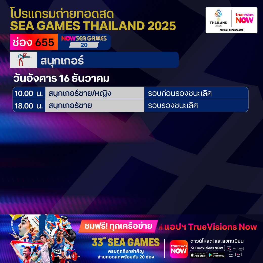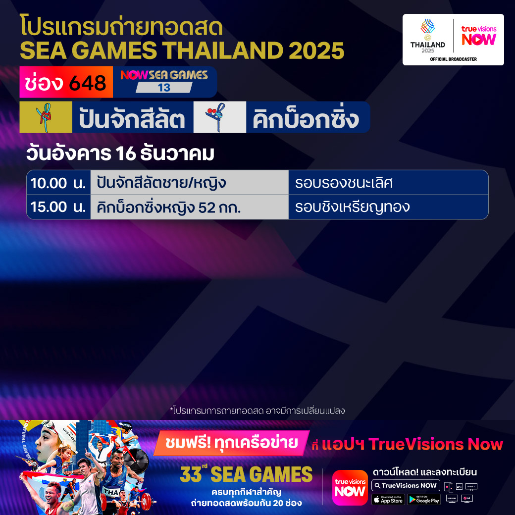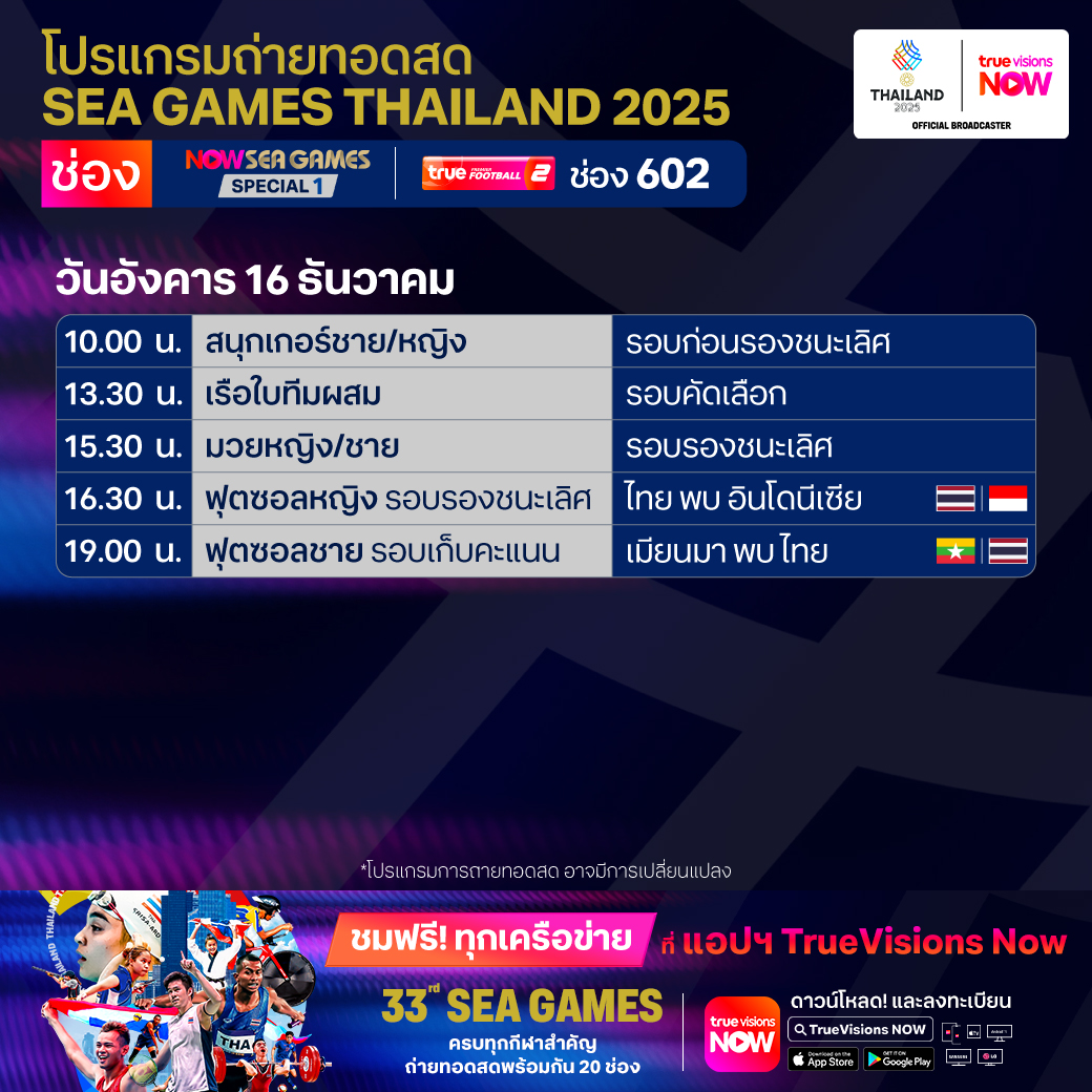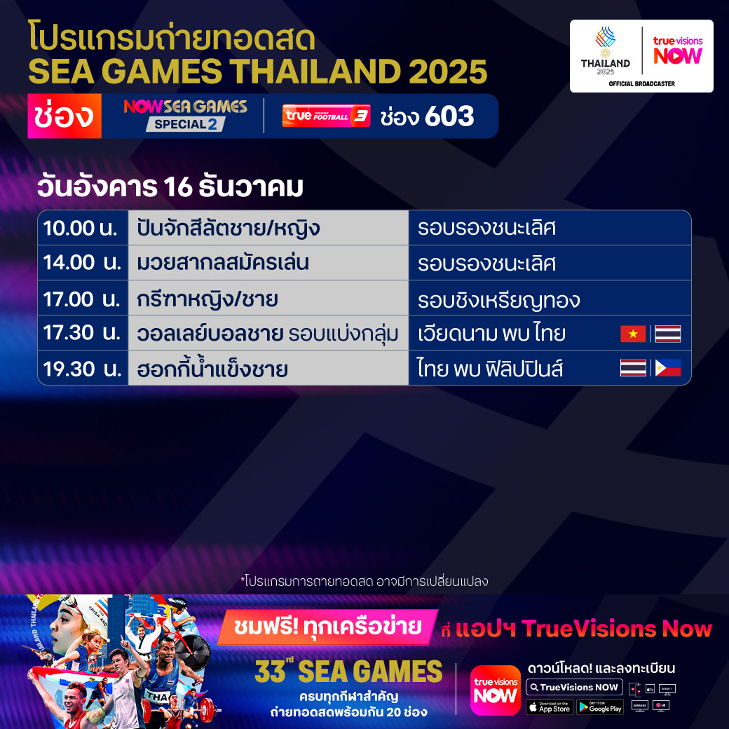 วันนี้มีอะไรดูที่ ทรูวิชั่นส์ ประจำวันอังคารที่ 16 ธันวาคม 68 ยังคงมีกีฬาที่น่าสนใจให้ได้ตามลุ้นตามเชียร์กันเหมือนเดิม โดยในส่วนของกีฬาซีเกมส์ 2025 ยังมีถ่ายทอดสดหลายชนิดกีฬาให้ได้ติดตามกัน นอกจากนี้กีฬาอื่นๆ ยังมี เวิลด์ สนุกเกอร์ ทัวร์ รายการ สกอตติช โอเพ่น และ วอลเลย์บอล วี-ลีก งานนี้ ทรูวิชั่นส์ จัดเต็มให้ชมกันถึงบ้าน
