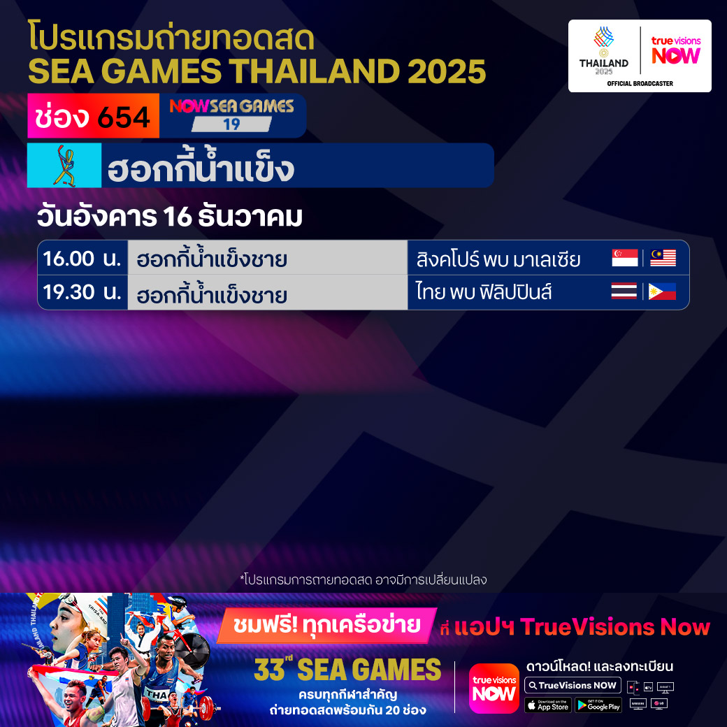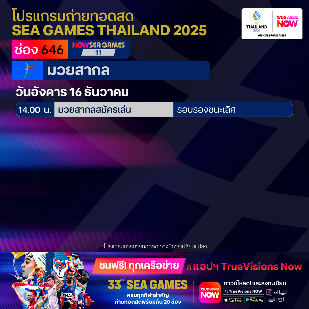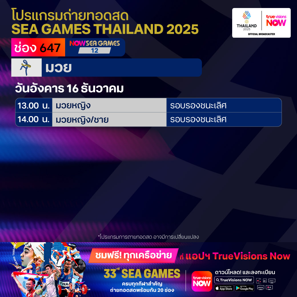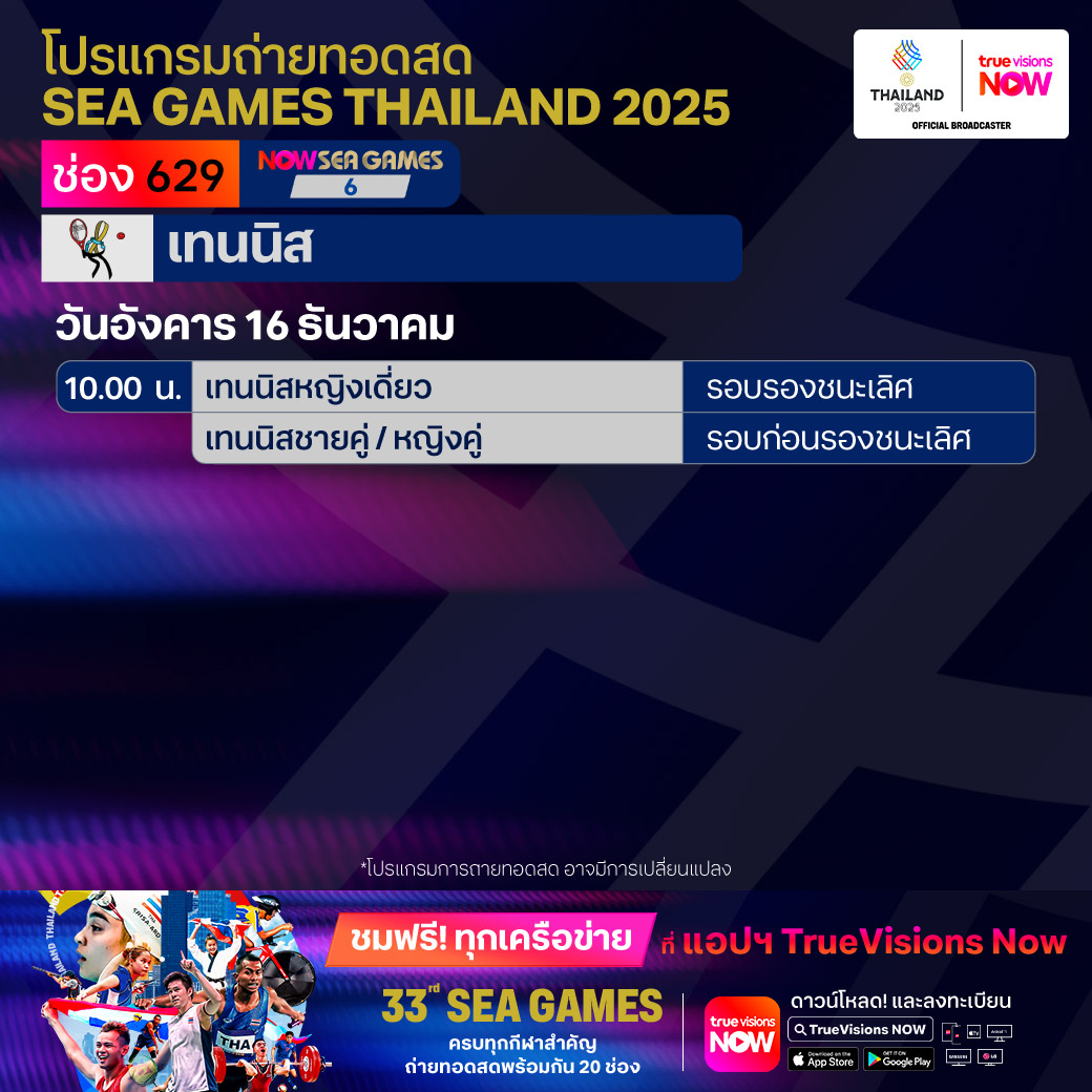วันนี้มีอะไรดูที่ ทรูวิชั่นส์ ประจำวันอังคารที่ 16 ธันวาคม 68 ยังคงมีกีฬาที่น่าสนใจให้ได้ตามลุ้นตามเชียร์กันเหมือนเดิม โดยในส่วนของกีฬาซีเกมส์ 2025 ยังมีถ่ายทอดสดหลายชนิดกีฬาให้ได้ติดตามกัน นอกจากนี้กีฬาอื่นๆ ยังมี เวิลด์ สนุกเกอร์ ทัวร์ รายการ สกอตติช โอเพ่น และ วอลเลย์บอล วี-ลีก งานนี้ ทรูวิชั่นส์ จัดเต็มให้ชมกันถึงบ้าน
