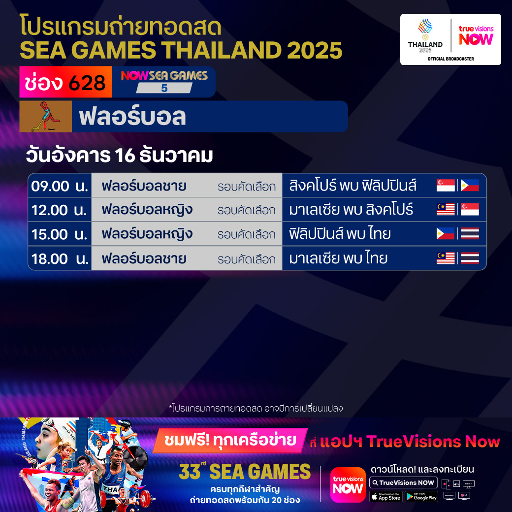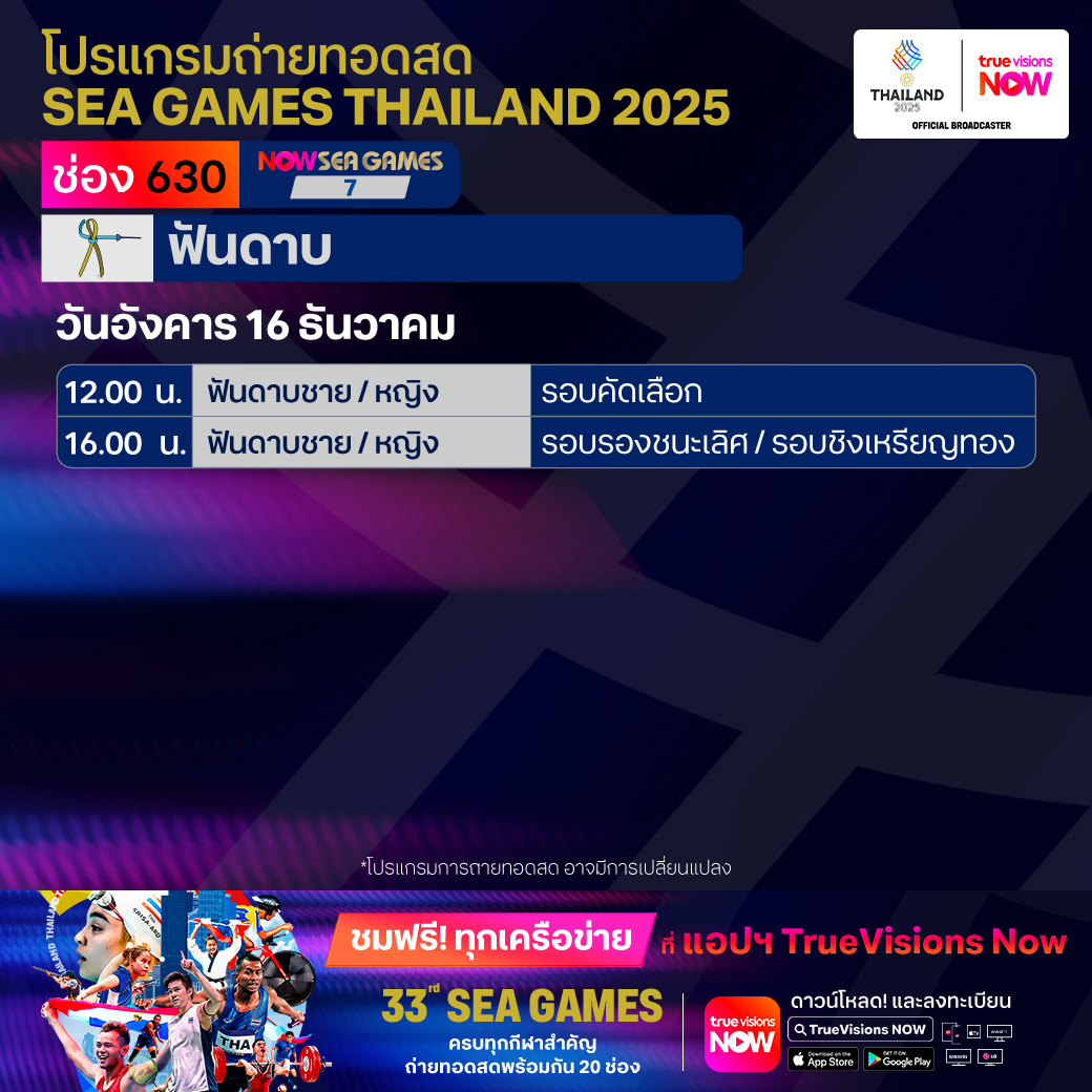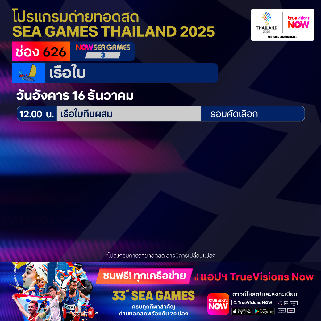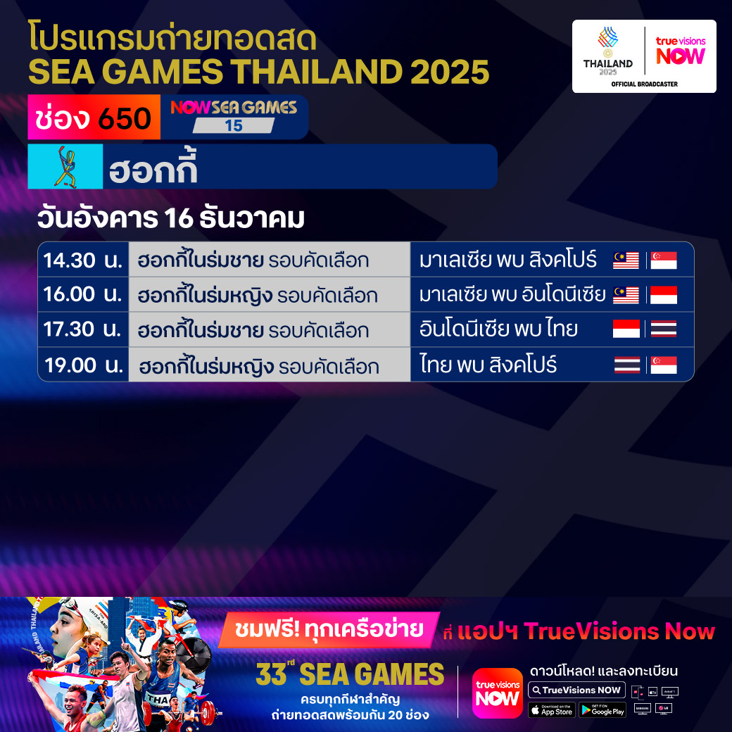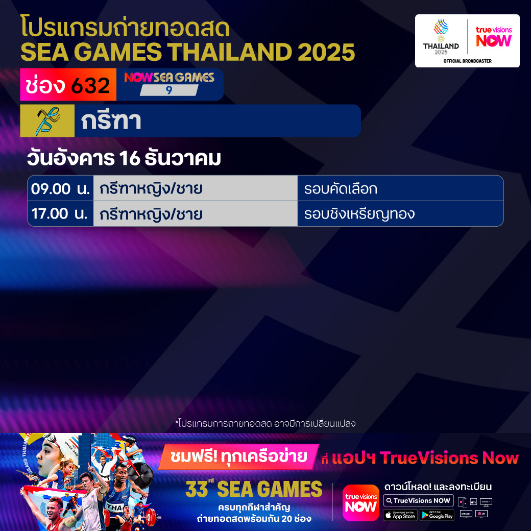 วันนี้มีอะไรดูที่ ทรูวิชั่นส์ ประจำวันอังคารที่ 16 ธันวาคม 68 ยังคงมีกีฬาที่น่าสนใจให้ได้ตามลุ้นตามเชียร์กันเหมือนเดิม โดยในส่วนของกีฬาซีเกมส์ 2025 ยังมีถ่ายทอดสดหลายชนิดกีฬาให้ได้ติดตามกัน นอกจากนี้กีฬาอื่นๆ ยังมี เวิลด์ สนุกเกอร์ ทัวร์ รายการ สกอตติช โอเพ่น และ วอลเลย์บอล วี-ลีก งานนี้ ทรูวิชั่นส์ จัดเต็มให้ชมกันถึงบ้าน