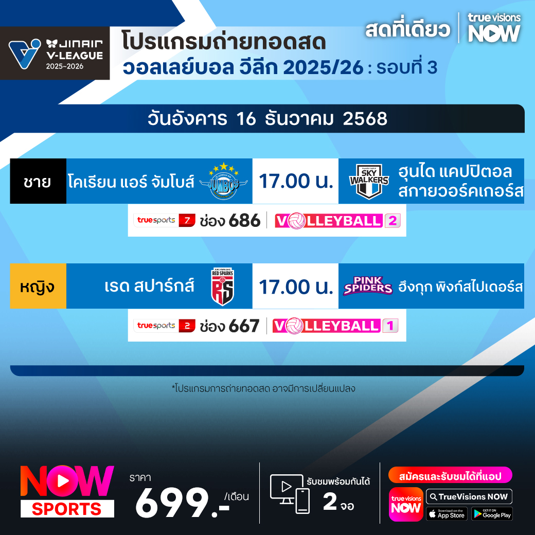 โคเรียน แอร์ จัมโบส์ พบ ฮุนได แคปปิตอล สกายวอร์คเกอร์ส เวลา 17.00 ทางช่อง TS 7 (686) / Volleyball 2