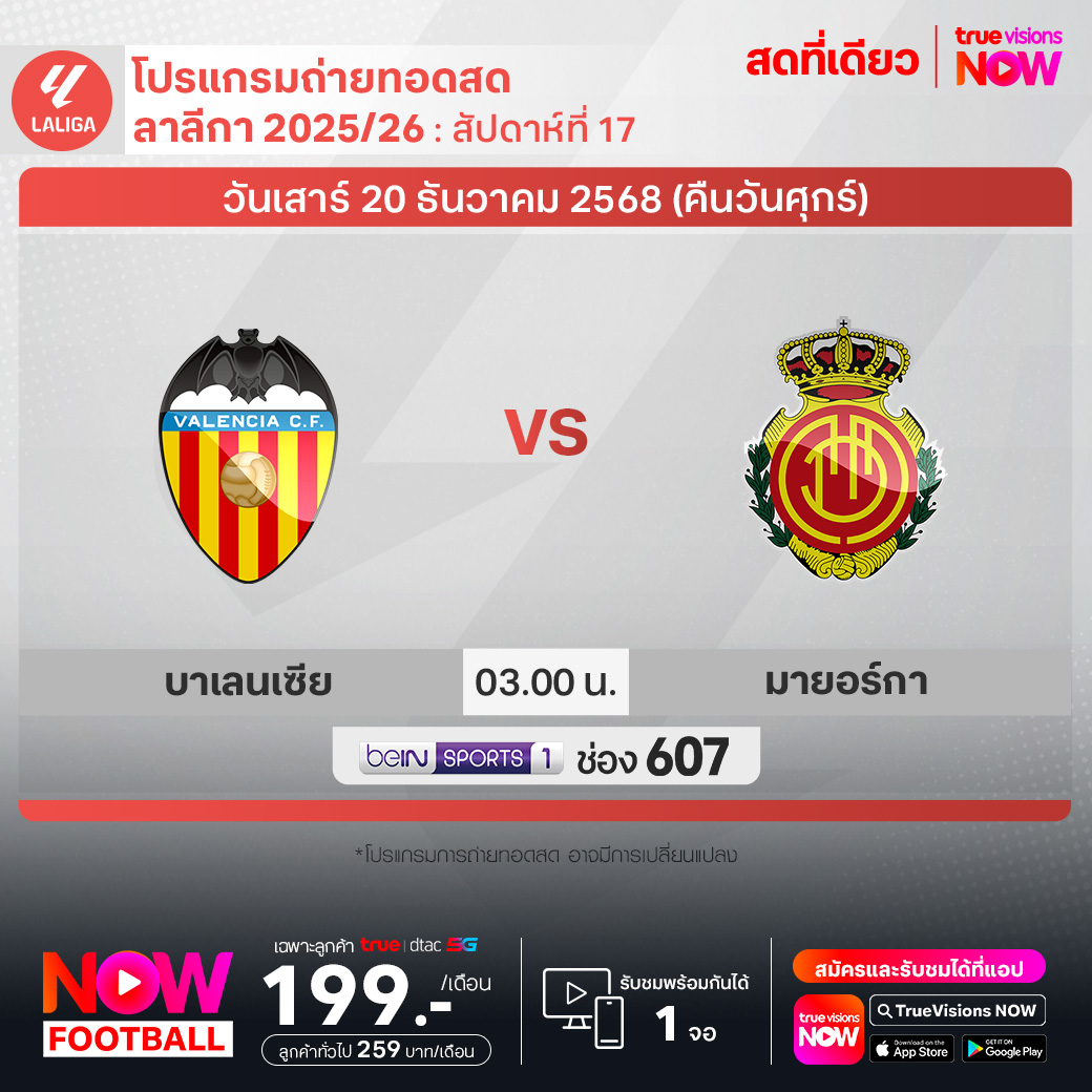 Valencia vs Mallorca เวลา 03.00-05.00 ทางช่อง beIN 1 (607)