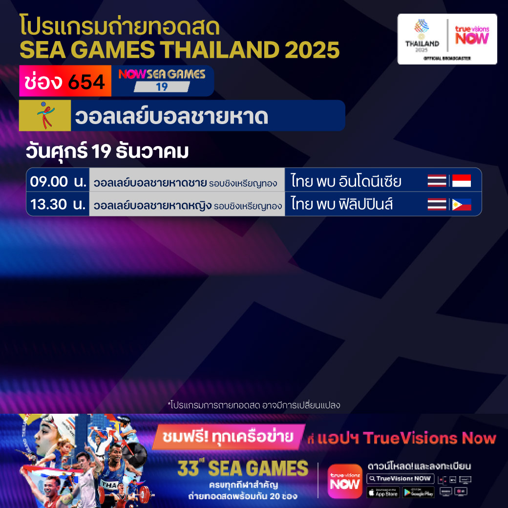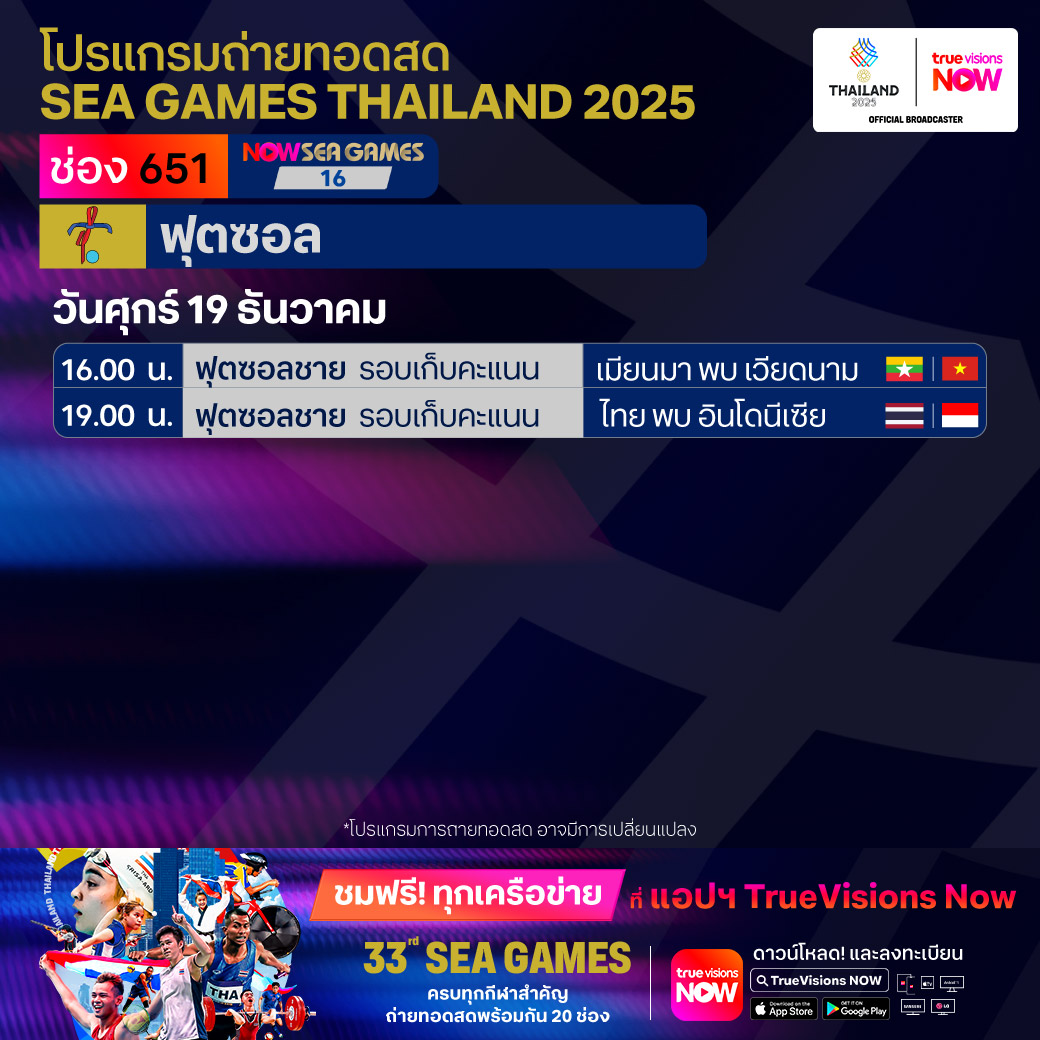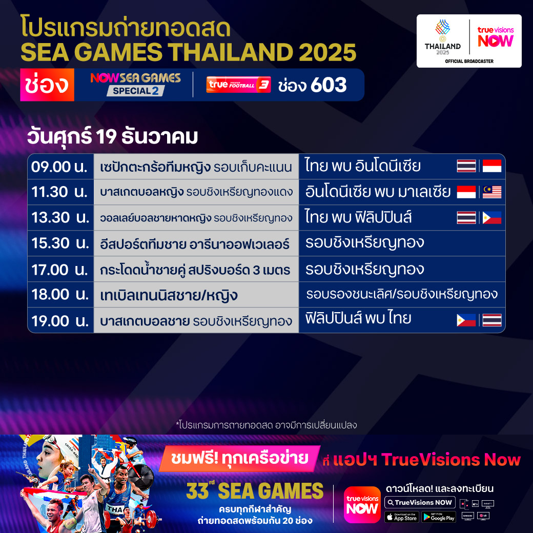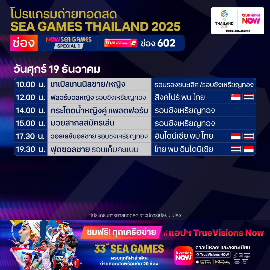 วันนี้มีอะไรดูที่ ทรูวิชั่นส์ ประจำวันศุกร์ที่ 19 ธันวาคม 68 ยังคงมีกีฬาที่น่าสนใจให้ได้ตามลุ้นตามเชียร์กันเหมือนเดิม โดยในส่วนของฟุตบอลยังมีศึก ลา ลีกา สเปน, บุนเดสลีกา เยอรมนี, ซูเปอร์โคปปา อิตาเลียน่า และ เอ-ลีก ออสเตรเลีย ให้ได้ตามเชียร์กันต่อ ขณะที่กีฬาซีเกมส์ 2025 ยังมีถ่ายทอดสดหลายชนิดกีฬาให้ได้ติดตามกันเหมือนเดิม ส่วนกีฬาอื่นๆ ยังมี กอล์ฟ ดีพี เวิลด์ ทัวร์ รายการ มอริเชียส โอเพ่น, พีจีเอ ทัวร์ แชมเปี้ยนสฺ์ รายการ พีเอ็นซี แชมเปี้ยนชิพ, เวิลด์ สนุกเกอร์ ทัวร์ รายการ สกอตติช โอเพ่น, แบดมินตัน บีดับเบิ้ลยูเอฟ รายการ เวิลด์ ทัวร์ ไฟนอลส์ และ วอลเลย์บอล วี-ลีก งานนี้ ทรูวิชั่นส์ จัดเต็มให้ชมกันถึงบ้าน