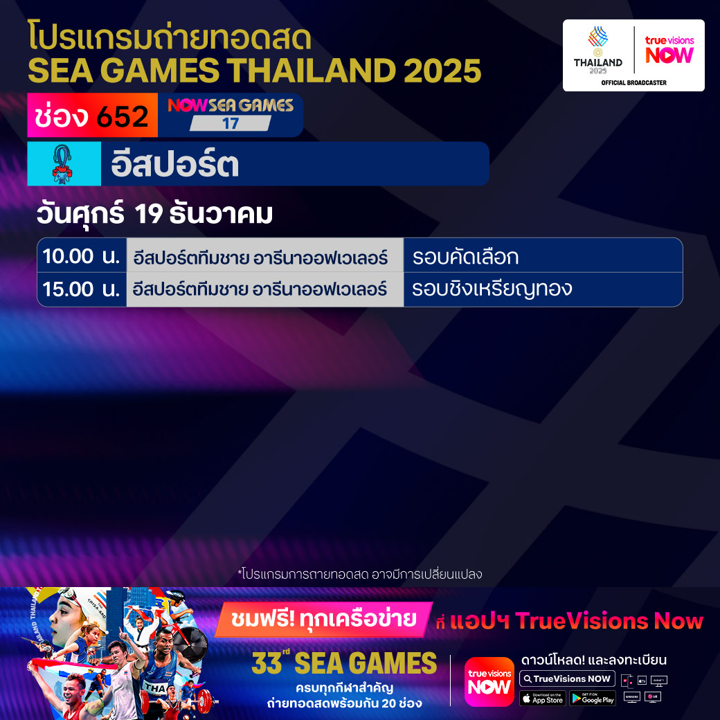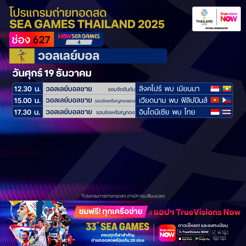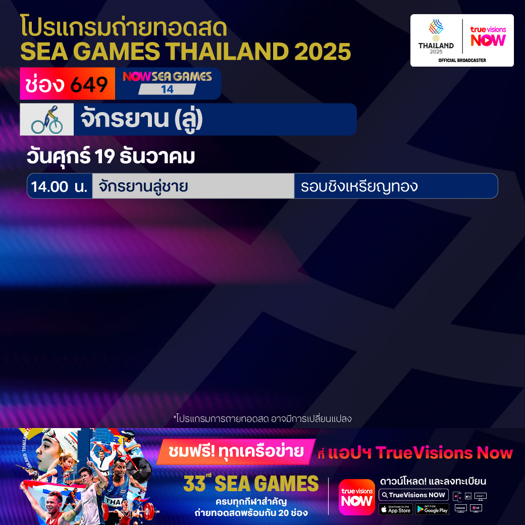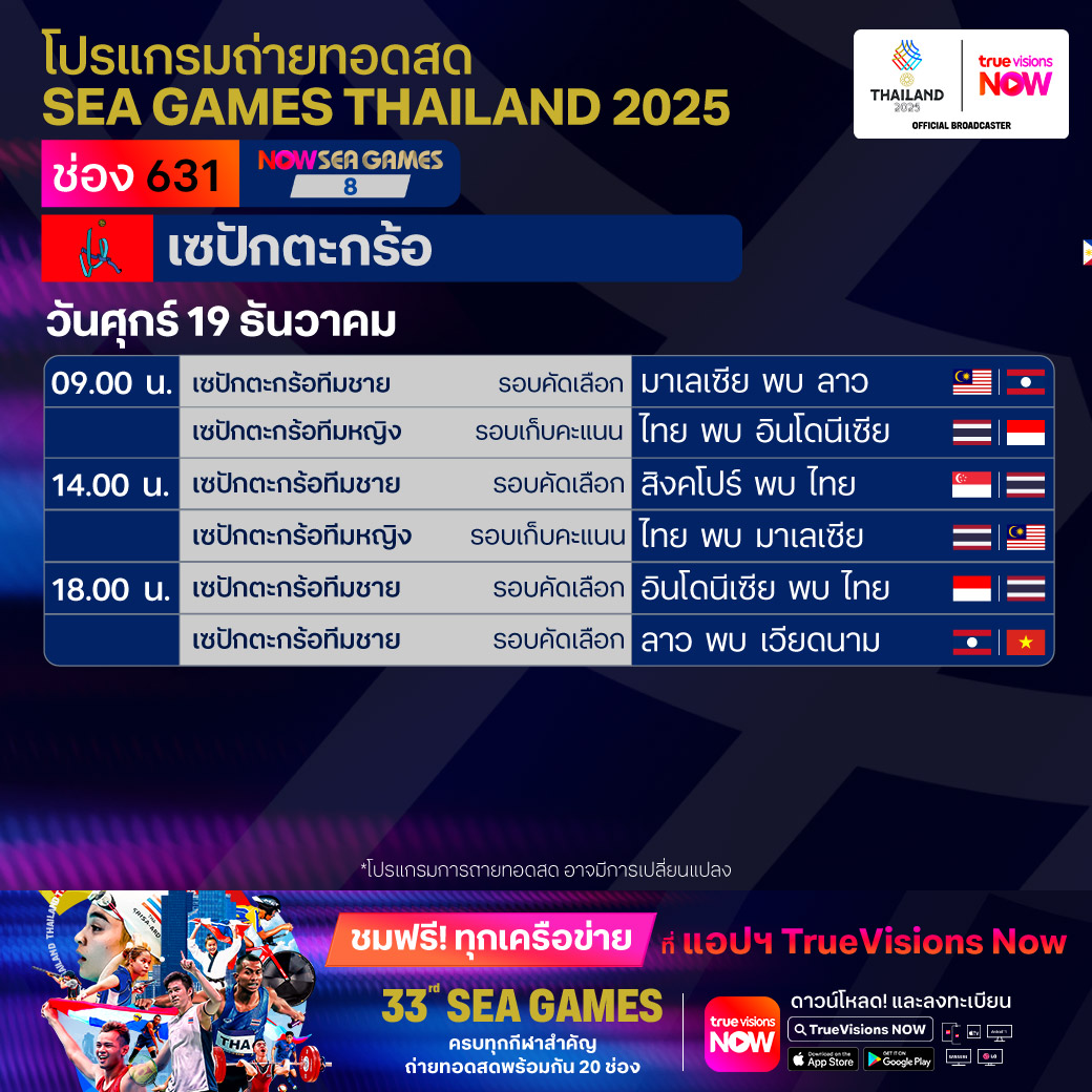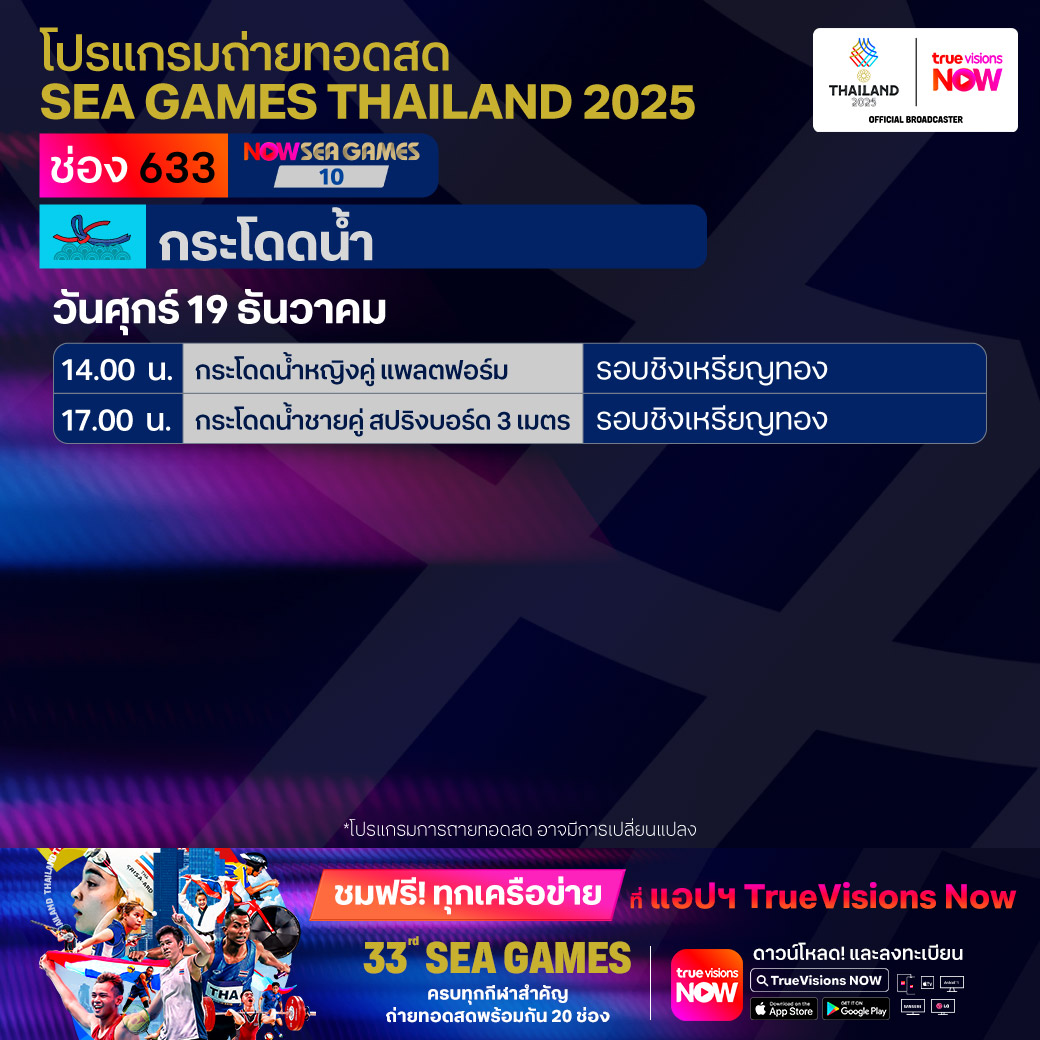 วันนี้มีอะไรดูที่ ทรูวิชั่นส์ ประจำวันศุกร์ที่ 19 ธันวาคม 68 ยังคงมีกีฬาที่น่าสนใจให้ได้ตามลุ้นตามเชียร์กันเหมือนเดิม โดยในส่วนของฟุตบอลยังมีศึก ลา ลีกา สเปน, บุนเดสลีกา เยอรมนี, ซูเปอร์โคปปา อิตาเลียน่า และ เอ-ลีก ออสเตรเลีย ให้ได้ตามเชียร์กันต่อ ขณะที่กีฬาซีเกมส์ 2025 ยังมีถ่ายทอดสดหลายชนิดกีฬาให้ได้ติดตามกันเหมือนเดิม ส่วนกีฬาอื่นๆ ยังมี กอล์ฟ ดีพี เวิลด์ ทัวร์ รายการ มอริเชียส โอเพ่น, พีจีเอ ทัวร์ แชมเปี้ยนสฺ์ รายการ พีเอ็นซี แชมเปี้ยนชิพ, เวิลด์ สนุกเกอร์ ทัวร์ รายการ สกอตติช โอเพ่น, แบดมินตัน บีดับเบิ้ลยูเอฟ รายการ เวิลด์ ทัวร์ ไฟนอลส์ และ วอลเลย์บอล วี-ลีก งานนี้ ทรูวิชั่นส์ จัดเต็มให้ชมกันถึงบ้าน