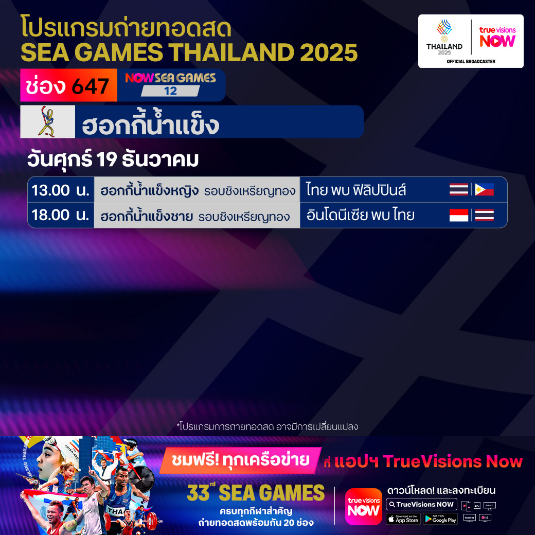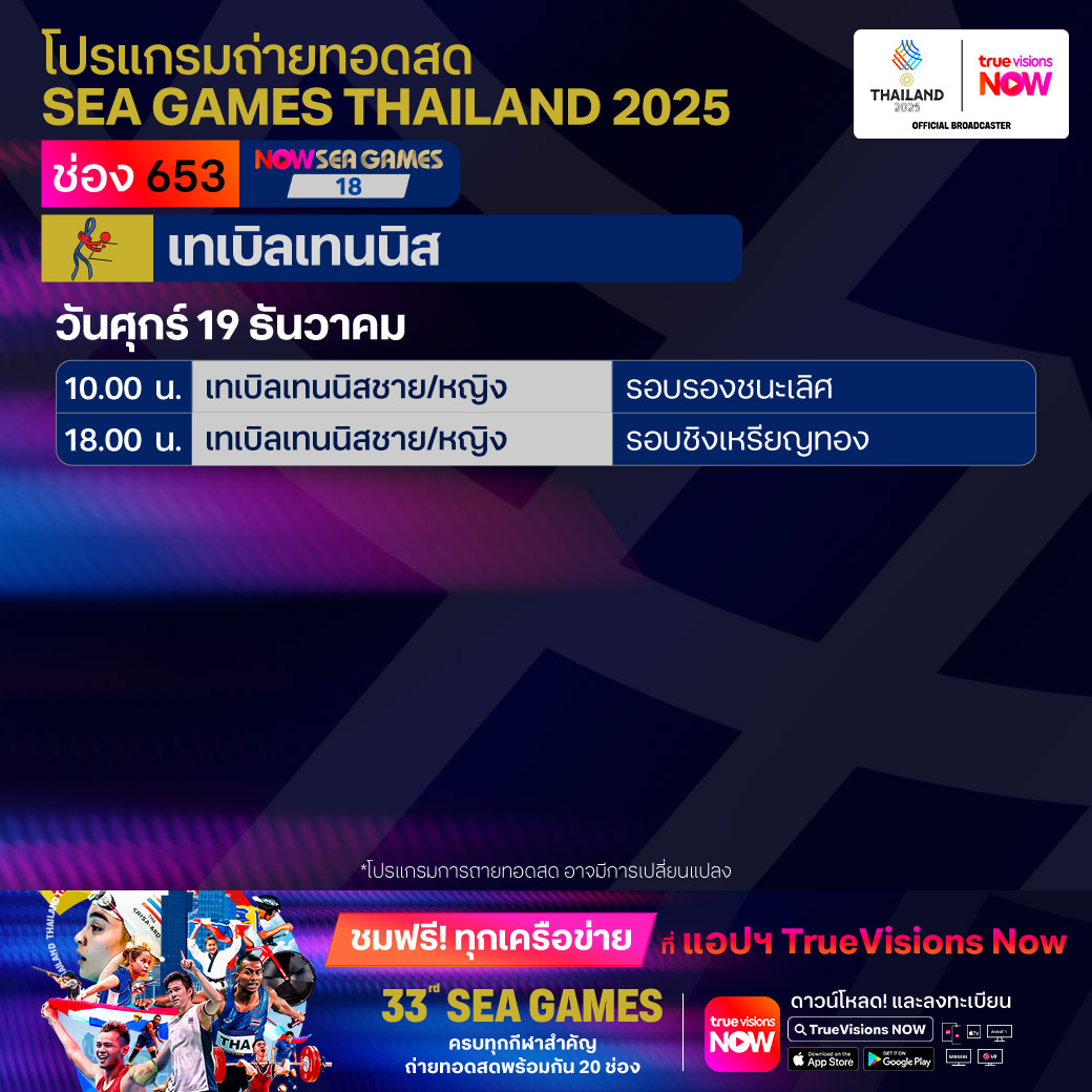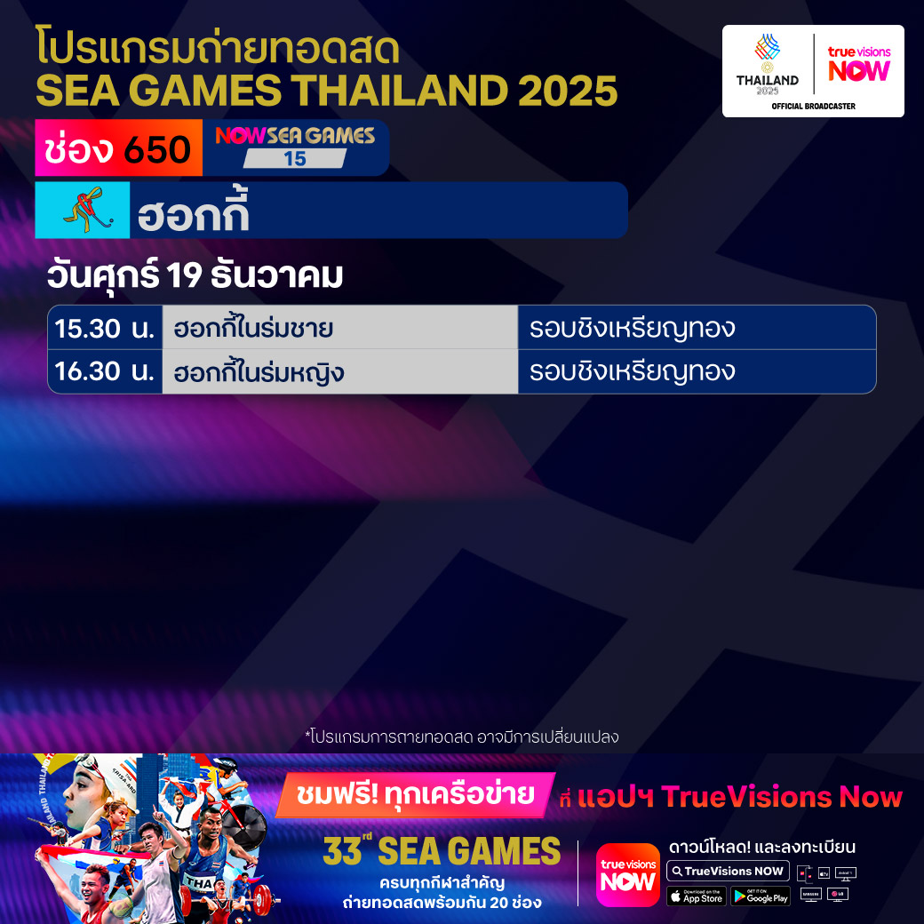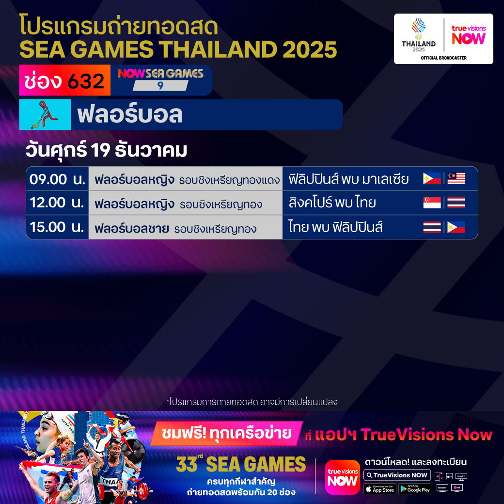 วันนี้มีอะไรดูที่ ทรูวิชั่นส์ ประจำวันศุกร์ที่ 19 ธันวาคม 68 ยังคงมีกีฬาที่น่าสนใจให้ได้ตามลุ้นตามเชียร์กันเหมือนเดิม โดยในส่วนของฟุตบอลยังมีศึก ลา ลีกา สเปน, บุนเดสลีกา เยอรมนี, ซูเปอร์โคปปา อิตาเลียน่า และ เอ-ลีก ออสเตรเลีย ให้ได้ตามเชียร์กันต่อ ขณะที่กีฬาซีเกมส์ 2025 ยังมีถ่ายทอดสดหลายชนิดกีฬาให้ได้ติดตามกันเหมือนเดิม ส่วนกีฬาอื่นๆ ยังมี กอล์ฟ ดีพี เวิลด์ ทัวร์ รายการ มอริเชียส โอเพ่น, พีจีเอ ทัวร์ แชมเปี้ยนสฺ์ รายการ พีเอ็นซี แชมเปี้ยนชิพ, เวิลด์ สนุกเกอร์ ทัวร์ รายการ สกอตติช โอเพ่น, แบดมินตัน บีดับเบิ้ลยูเอฟ รายการ เวิลด์ ทัวร์ ไฟนอลส์ และ วอลเลย์บอล วี-ลีก งานนี้ ทรูวิชั่นส์ จัดเต็มให้ชมกันถึงบ้าน