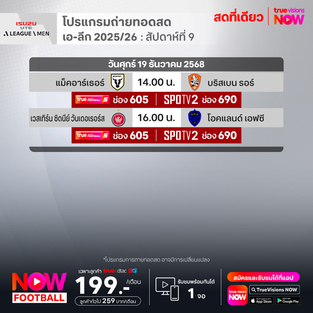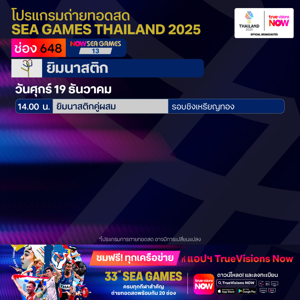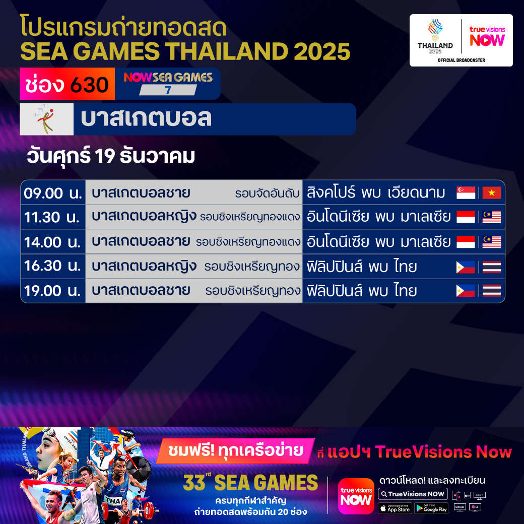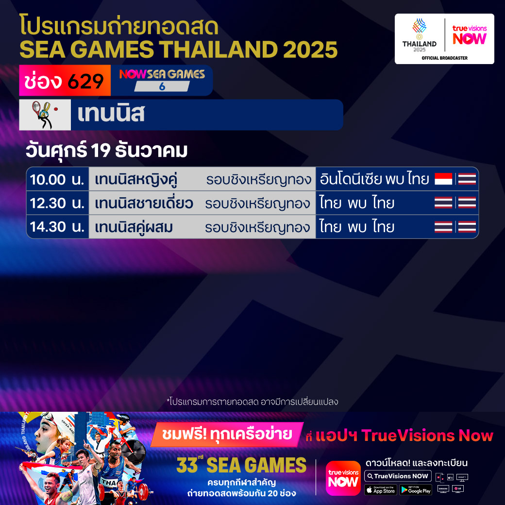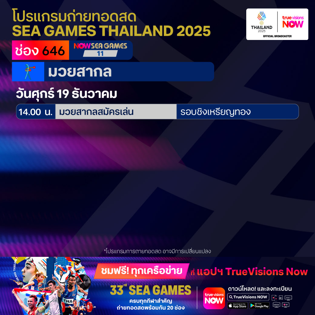 วันนี้มีอะไรดูที่ ทรูวิชั่นส์ ประจำวันศุกร์ที่ 19 ธันวาคม 68 ยังคงมีกีฬาที่น่าสนใจให้ได้ตามลุ้นตามเชียร์กันเหมือนเดิม โดยในส่วนของฟุตบอลยังมีศึก ลา ลีกา สเปน, บุนเดสลีกา เยอรมนี, ซูเปอร์โคปปา อิตาเลียน่า และ เอ-ลีก ออสเตรเลีย ให้ได้ตามเชียร์กันต่อ ขณะที่กีฬาซีเกมส์ 2025 ยังมีถ่ายทอดสดหลายชนิดกีฬาให้ได้ติดตามกันเหมือนเดิม ส่วนกีฬาอื่นๆ ยังมี กอล์ฟ ดีพี เวิลด์ ทัวร์ รายการ มอริเชียส โอเพ่น, พีจีเอ ทัวร์ แชมเปี้ยนสฺ์ รายการ พีเอ็นซี แชมเปี้ยนชิพ, เวิลด์ สนุกเกอร์ ทัวร์ รายการ สกอตติช โอเพ่น, แบดมินตัน บีดับเบิ้ลยูเอฟ รายการ เวิลด์ ทัวร์ ไฟนอลส์ และ วอลเลย์บอล วี-ลีก งานนี้ ทรูวิชั่นส์ จัดเต็มให้ชมกันถึงบ้าน