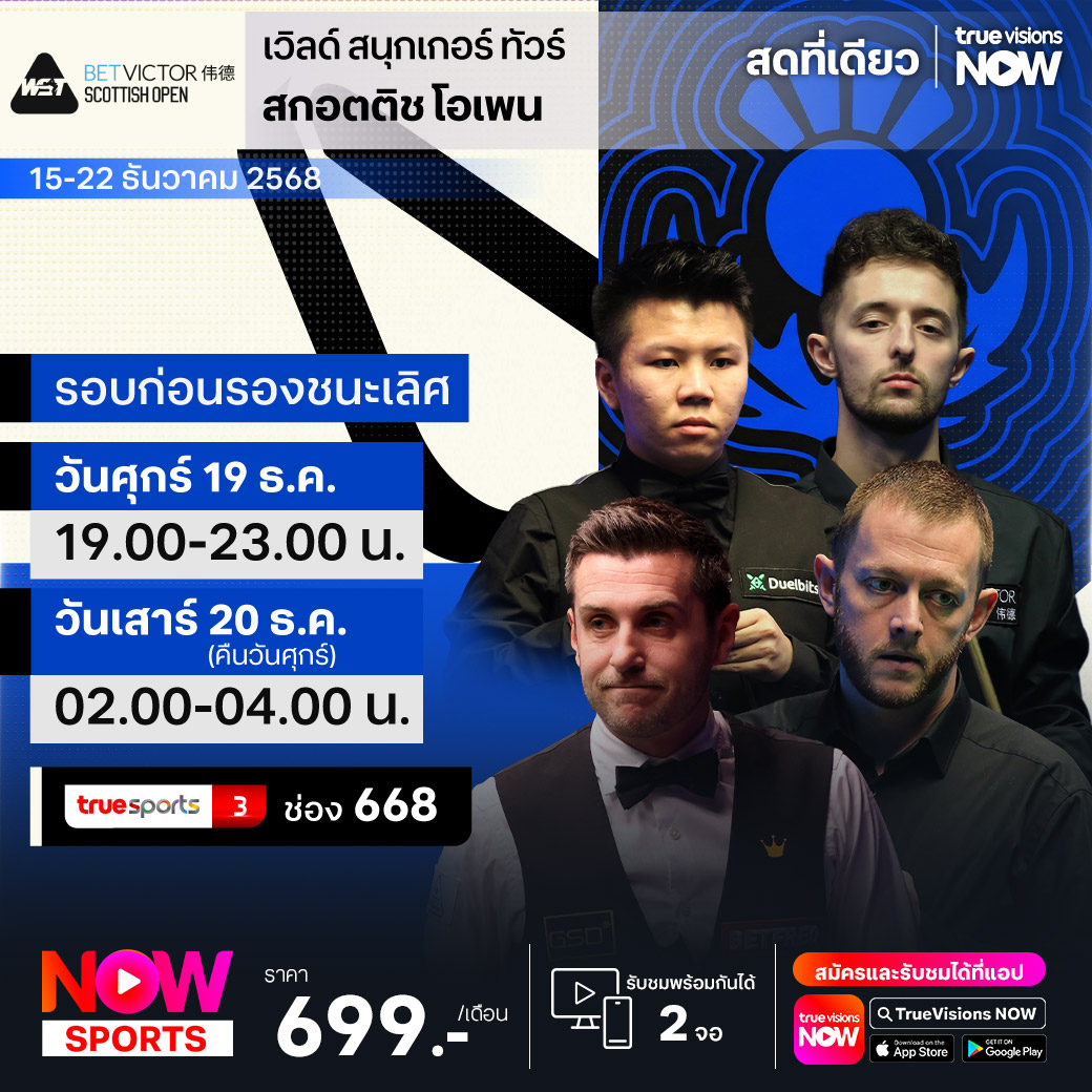 สนุกเกอร์เก็บคะแนนสะสมโลกฤดูกาล 2025/26 กำลังสนุกเข้มข้น สัปดาห์นี้ส่งท้ายปี 2025 กับรายการที่เก่าแก่และยิ่งใหญ่อย่าง สกอตติช โอเพ่น 1 ใน 4 ของ โฮม เนชั่นส์ ซีรี่ส์ ที่มี สตีเฟ่น เฮนดรี้ โทรฟี่ เป็นถ้วยชนะเลิศสำหรับแชมป์ ร่วมลุ้นกันว่าจอมแม่นคิวของโลก 128 คน ใครจะฝ่าฟันเข้าไปถึงรอบชิงชนะเลิศและเป็นแชมป์ในบั้นปลาย ชมสด ครบทุกรอบ ที่ ทรูวิชั่นส์