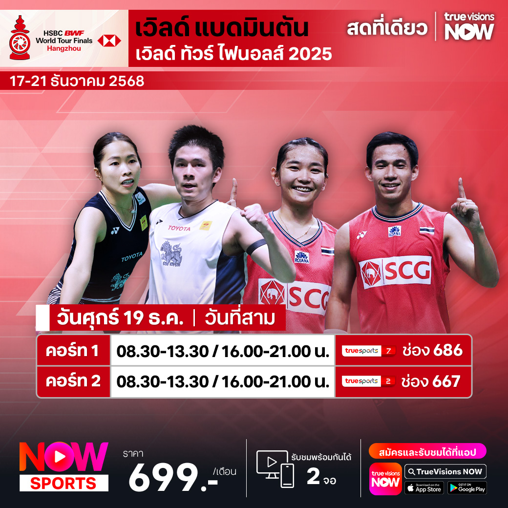 แบดมินตัน เก็บคะแนนสะสมโลก รายการท้ายสุดที่ยิ่งใหญ่ประจำปี 2025 เวิลด์ ทัวร์ ไฟนอลส์ ที่เมืองหางโจว ประเทศจีน ที่คัดมาเฉพาะสุดยอดฝีมือของโลกทั้ง 5 ประเภท มาดวลเพลงตบลูกขนไก่เพื่อตำแหน่งแชมป์แห่งศักดิ์ศรี ส่งใจเชียร์ตัวแทนจากประเทศไทย วิว กุลวุฒิ วิทิตศานต์, เมย์ รัชนก อินนทนนท์, หมิว พรปวีณ์ ช่อชูวงศ์ และคู่ผสมสุดฮ็อตของปีนี้ บาส เดชาพล พัววรานุเคราะห์ และ เฟม ศุภิสรา เพียวสามพราน ชมสด ครบทุกรอบ ที่ ทรูวิชั่นส์