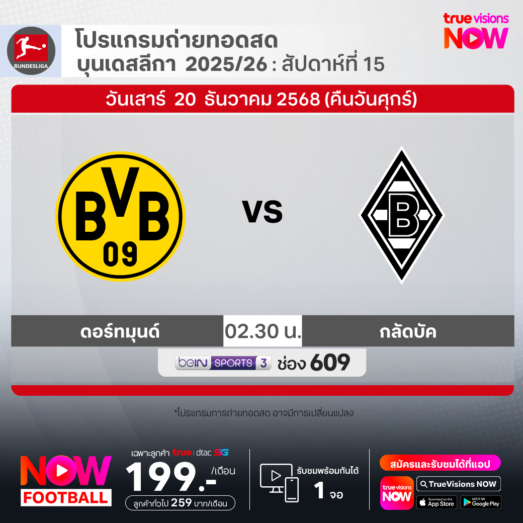 Dortmund vs Monchengladbach เวลา 02.30-04.30 ทางช่อง beIN 3 (609)