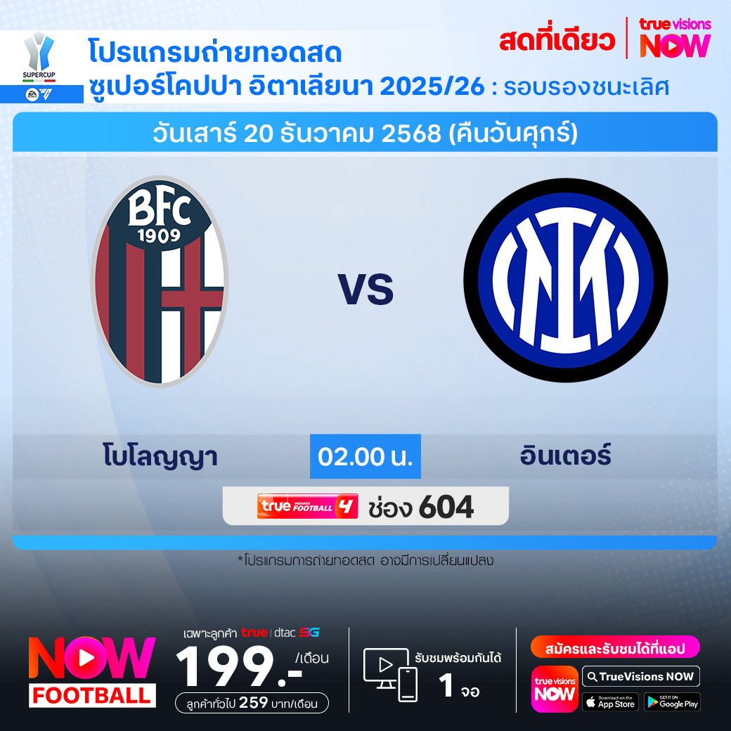 Bologna vs Inter เวลา 02.00-04.00 ทางช่องTPF 4(604)
