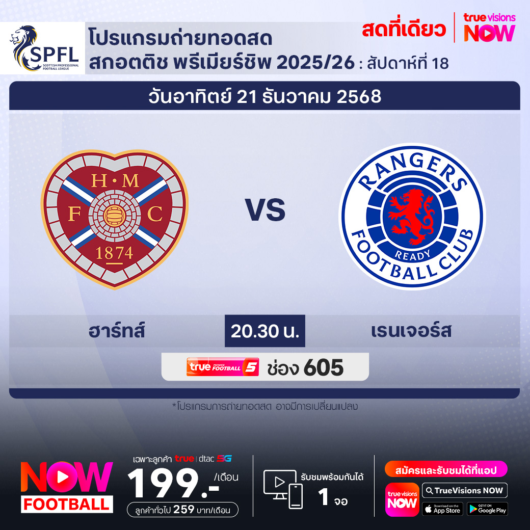 Heart of Midlothian vs Rangers เวลา 20.30-22.30 ทางช่องTPF 5(605)