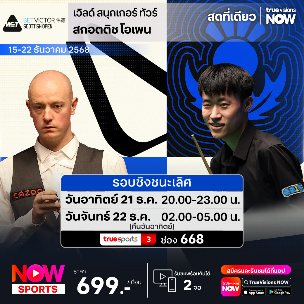 สนุกเกอร์เก็บคะแนนสะสมโลกฤดูกาล 2025/26 กำลังสนุกเข้มข้น สัปดาห์นี้ส่งท้ายปี 2025 กับรายการที่เก่าแก่และยิ่งใหญ่อย่าง สกอตติช โอเพ่น 1 ใน 4 ของ โฮม เนชั่นส์ ซีรี่ส์ ที่มี สตีเฟ่น เฮนดรี้ โทรฟี่ เป็นถ้วยชนะเลิศสำหรับแชมป์ ร่วมลุ้นกันว่าจอมแม่นคิวของโลก 128 คน ใครจะฝ่าฟันเข้าไปถึงรอบชิงชนะเลิศและเป็นแชมป์ในบั้นปลาย ชมสด ครบทุกรอบ ที่ ทรูวิชั่นส์
