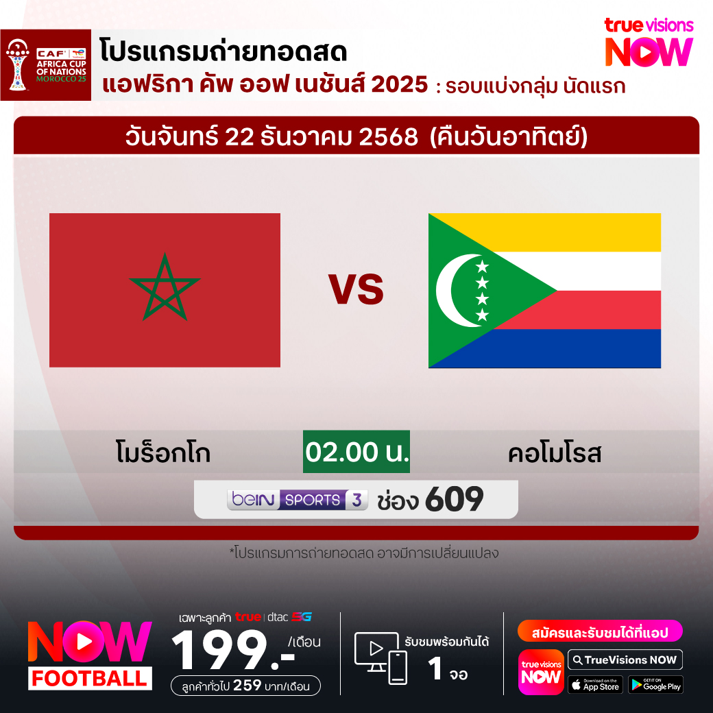 Morocco vs Comoros เวลา 02.00-04.00 ทางช่อง beIN 3 (609)
