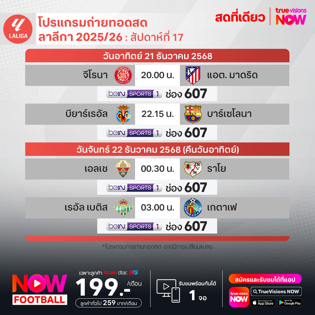 Real Betis vs Getafe เวลา 03.00-05.00 ทางช่อง beIN 1 (607)