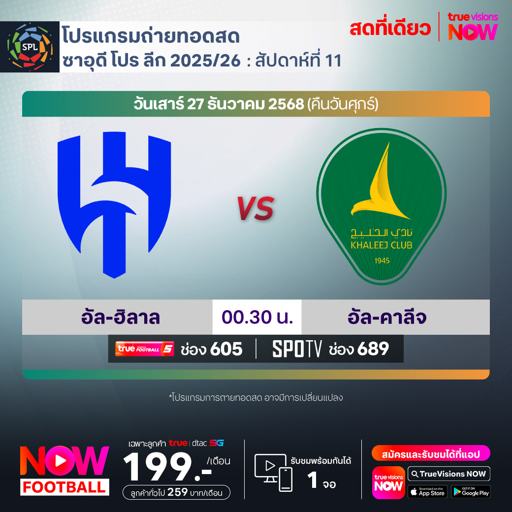 Al Hilal vs Al Khaleej เวลา 00.30-02.30 ทางช่องTPF 5(605) / SPOTV (689)