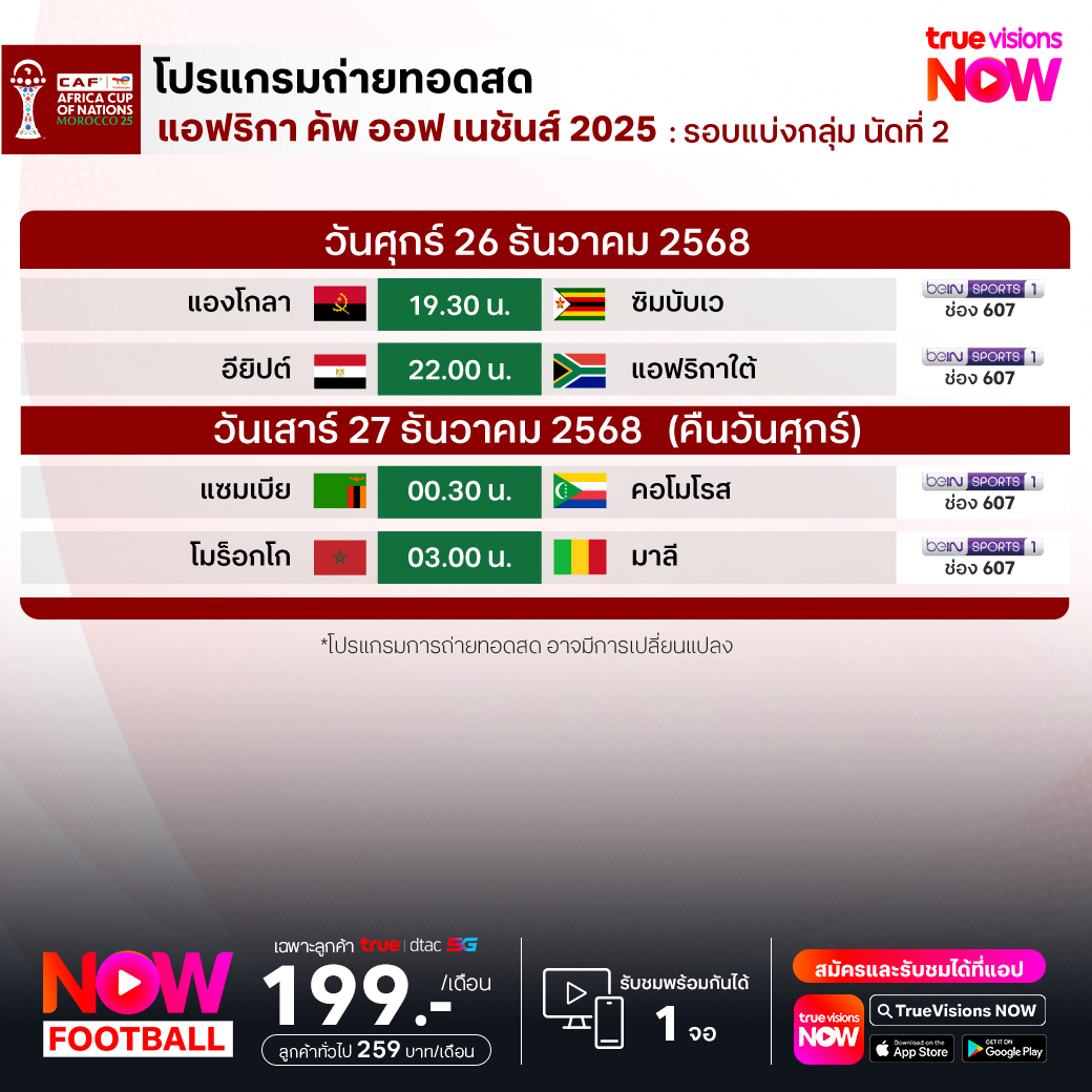 วันนี้มีอะไรดูที่ ทรูวิชั่นส์ ประจำวันศุกร์ที่ 26 ธันวาคม 68 ยังคงมีกีฬาที่น่าสนใจให้ได้ตามลุ้นตามเชียร์กันเหมือนเดิม โดยในส่วนของฟุตบอลนั้น ยังมีศึก แอฟริกา คัพ ออฟ เนชั่นส์, เอ-ลีก ออสเตรเลีย และ ซาอุดิ โปร ลีก ให้ได้ตามเชียร์กันต่อ ส่วนกีฬาอื่นๆ ยังมีฟุตซอลชิงแชมป์อาเซียนรุ่นอายุไม่เกิน 16 ปี และ วอลเลย์บอล วี-ลีก งานนี้ ทรูวิชั่นส์ จัดเต็มให้ชมกันถึงบ้าน