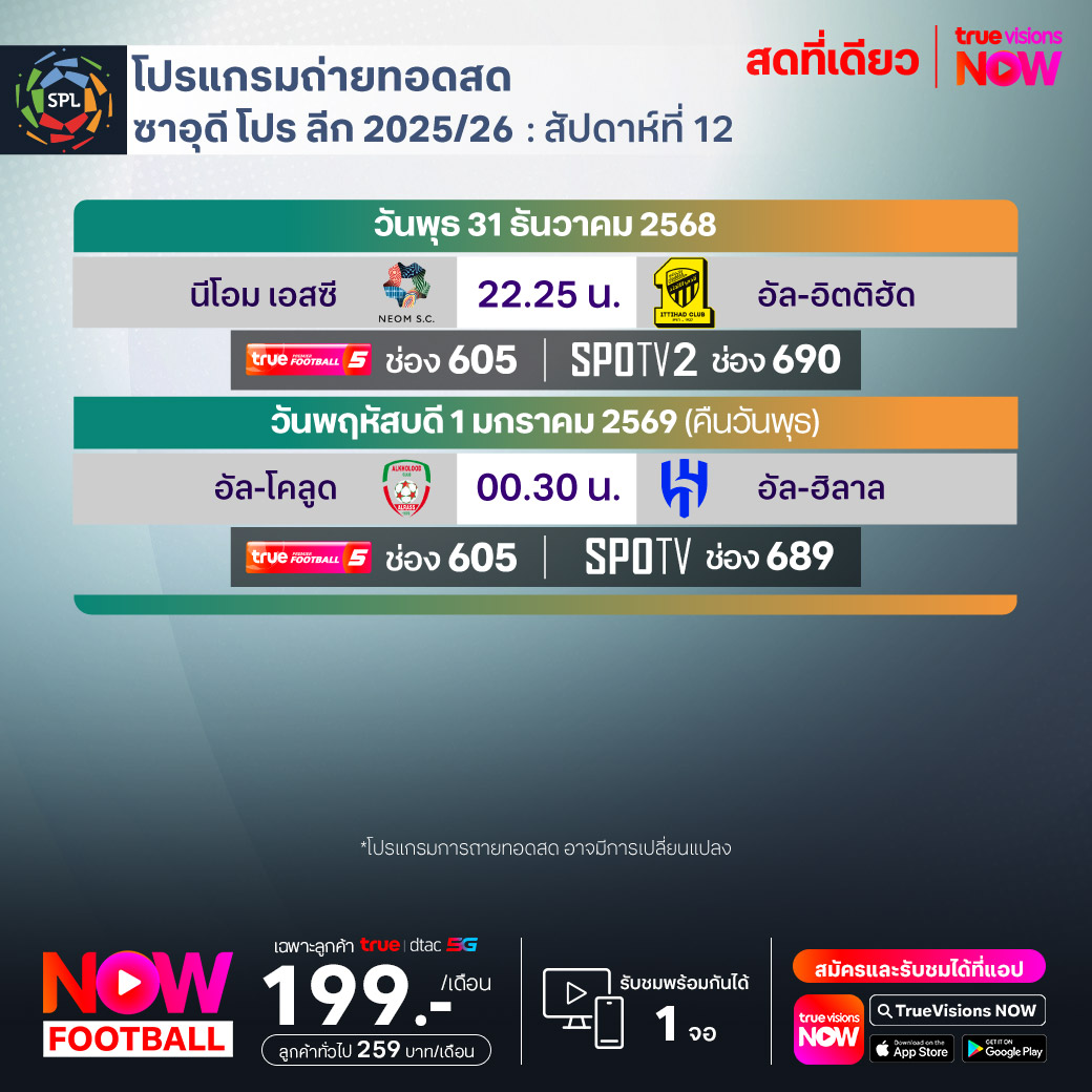 Neom vs Al Ittihad เวลา 22.25-00.25 ทางช่องTPF 5(605) / SPOTV2 (690)