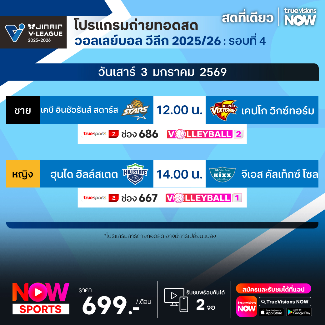 เคบี อินชัวรันส์ สตาร์ส พบ เคปโก วิกซ์ทอร์ม เวลา 12.00 ทางช่อง TS 7 (686) / Volleyball 2