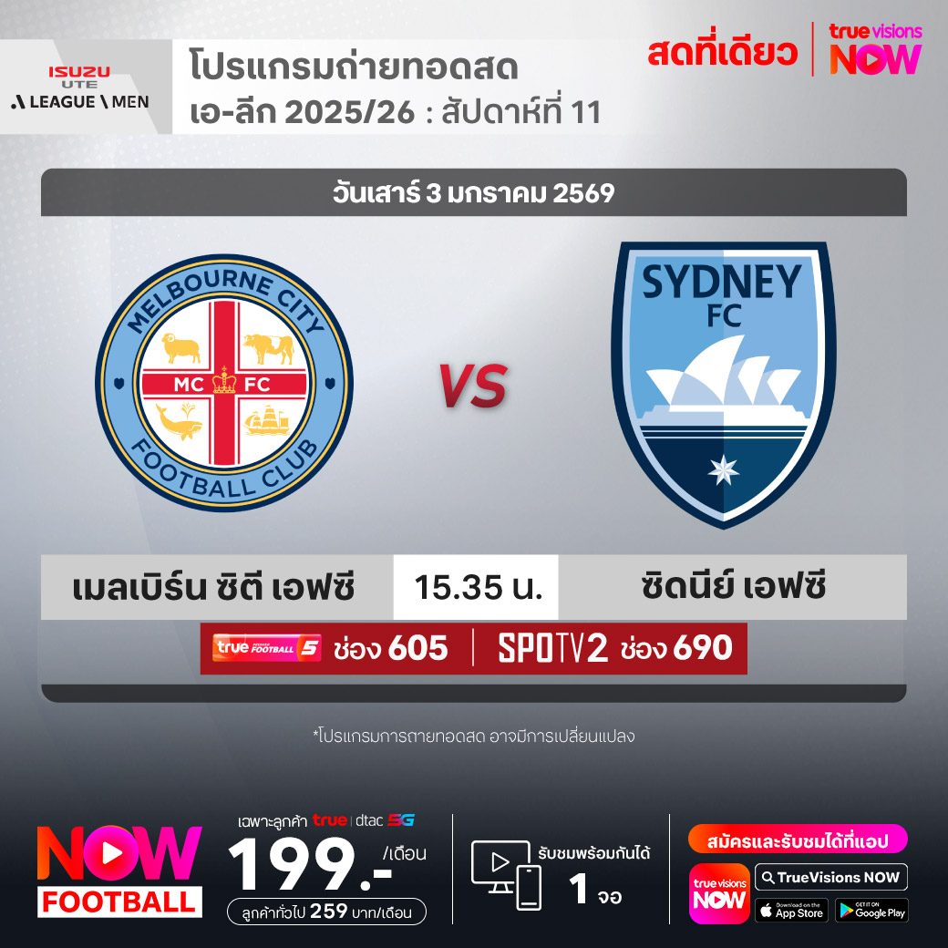 Melbourne City FC vs Sydney FC เวลา 15.35-17.35 ทางช่องTPF 5(605) / SPOTV2 (690)