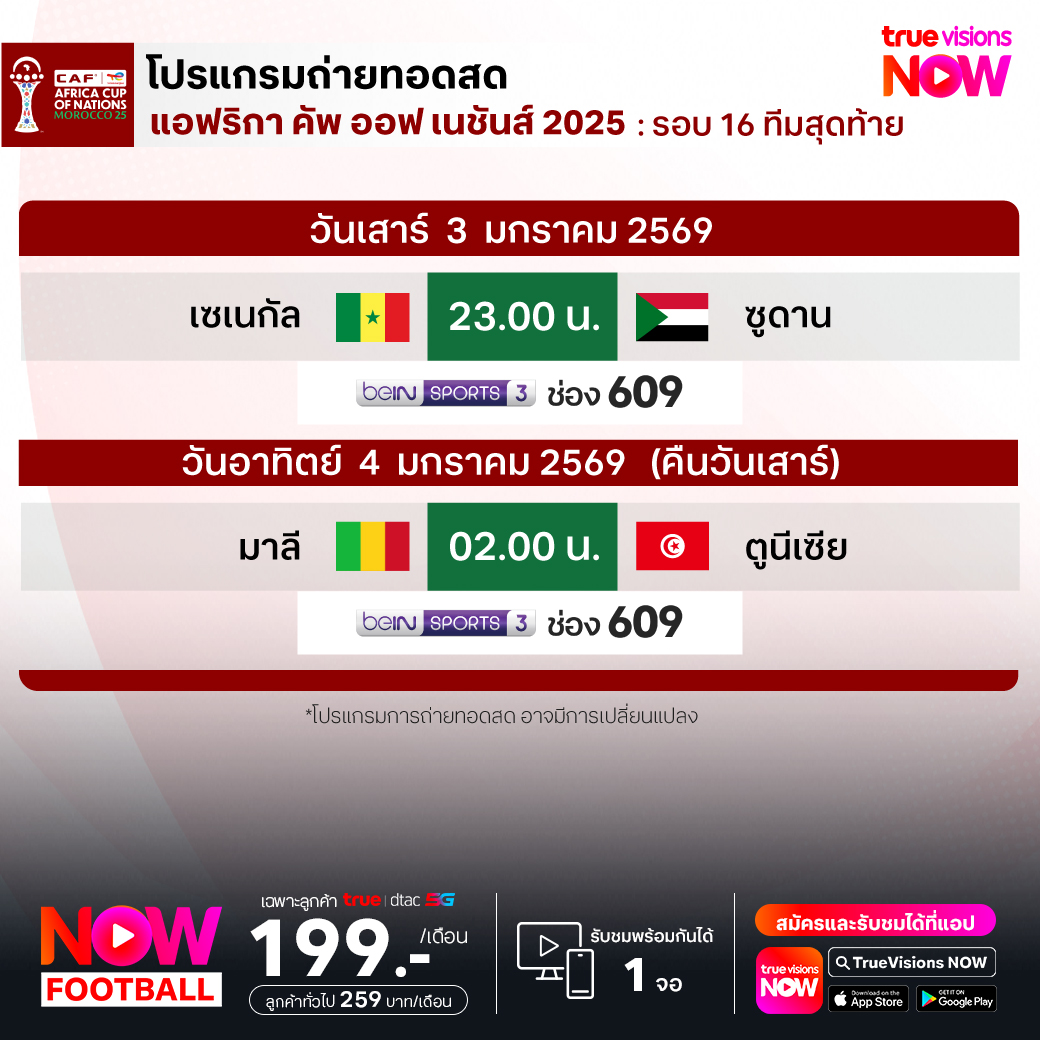 วันนี้มีอะไรดูที่ ทรูวิชั่นส์ ประจำวันเสาร์ที่ 3 มกราคม 69 ยังคงมีกีฬาที่น่าสนใจให้ได้ตามลุ้นตามเชียร์กันเหมือนเดิม โดยในส่วนของฟุตบอลนั้น ยังมีศึก แอฟริกา คัพ ออฟ เนชั่นส์ รอบ 16 ทีมสุดท้าย, ลา ลีกา สเปน, กัลโช่ เซเรีย อา อิตาลี, สกอตติช พรีเมียร์ชิพ, เอ-ลีก ออสเตรเลีย และ ซาอุดิ โปร ลีก ให้ได้ตามเชียร์กันต่อ ส่วนกีฬาอื่นๆ ยังมี วอลเลย์บอล วี-ลีก งานนี้ ทรูวิชั่นส์ จัดเต็มให้ชมกันถึงบ้าน