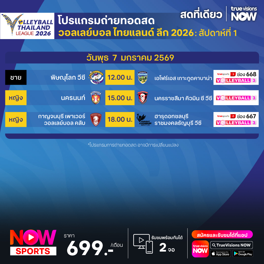 กาญจนบุรี เพาเวอร์ วอลเลย์บอล คลับ พบ ฮารุดอทชลบุรี ราชมงคลธัญบุรี วีซี เวลา 18.00 ทางช่อง TS 2 (667) / Volleyball 3