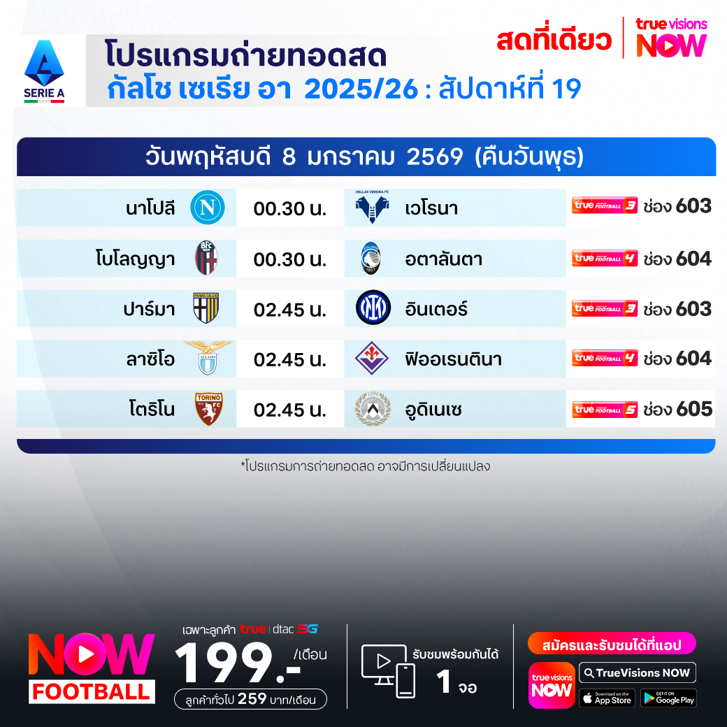 วันนี้มีอะไรดูที่ ทรูวิชั่นส์ ประจำวันพุธที่ 7 มกราคม 69 ยังคงมีกีฬาที่น่าสนใจให้ได้ตามลุ้นตามเชียร์กันเหมือนเดิม โดยในส่วนของฟุตบอลนั้น ยังมีศึก กัลโช่ เซเรีย อา อิตาลี ให้ได้ตามเชียร์กันต่อ ส่วนกีฬาอื่นๆ ยังมี เทนนิสหญิง ดับเบิ้ลยูทีเอ ทัวร์ รายการ บริสเบน อินเตอร์เนชั่นแนล, แบดมินตัน บีดับเบิ้ลยูเอฟ รายการ มาเลเซีย โอเพ่น, วอลเลย์บอล วี-ลีก และ วอลเลย์บอล ไทยแลนด์ ลีก งานนี้ ทรูวิชั่นส์ จัดเต็มให้ชมกันถึงบ้าน
