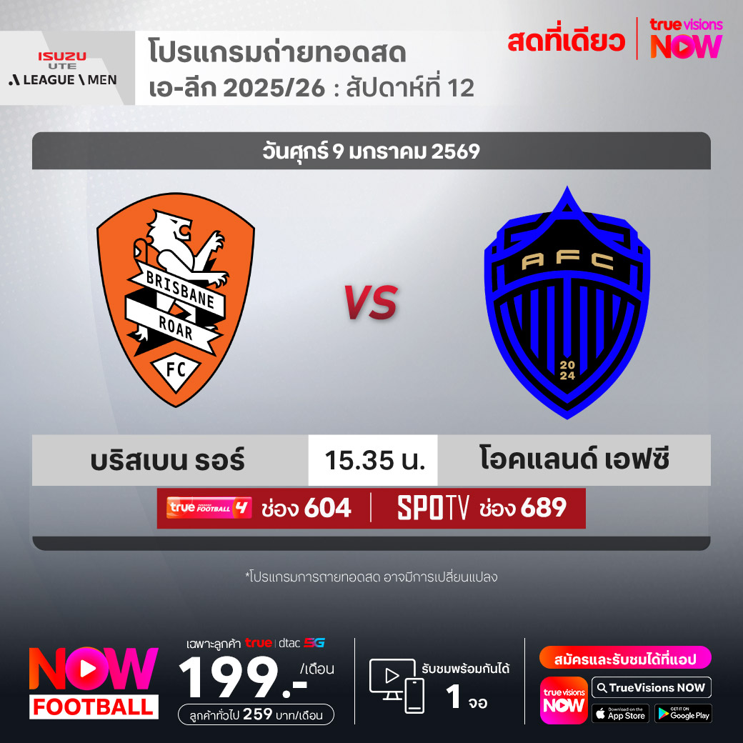 Brisbane Roar FC vs Auckland FC เวลา 15.35-17.35 ทางช่องTPF 4(604) / SPOTV (689)